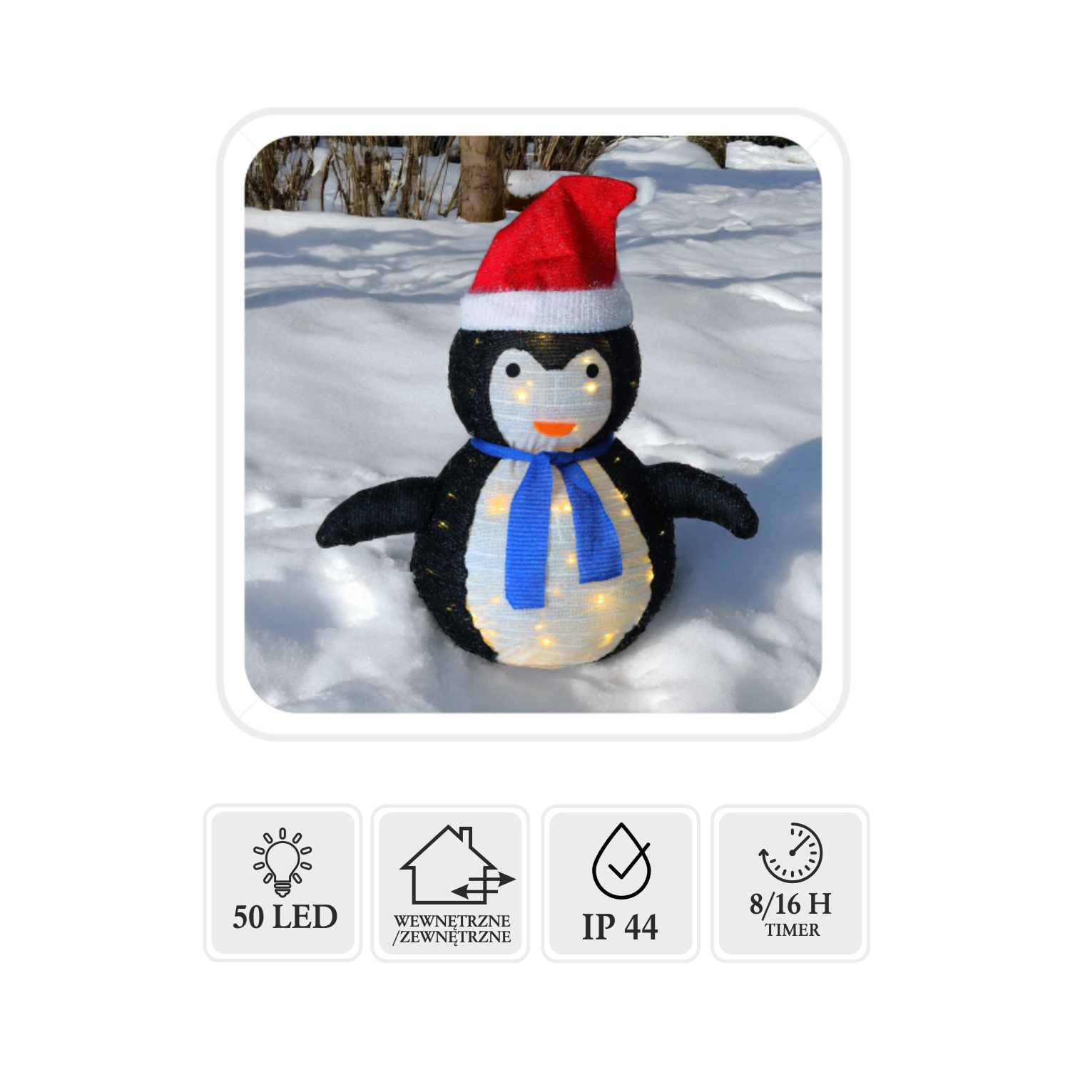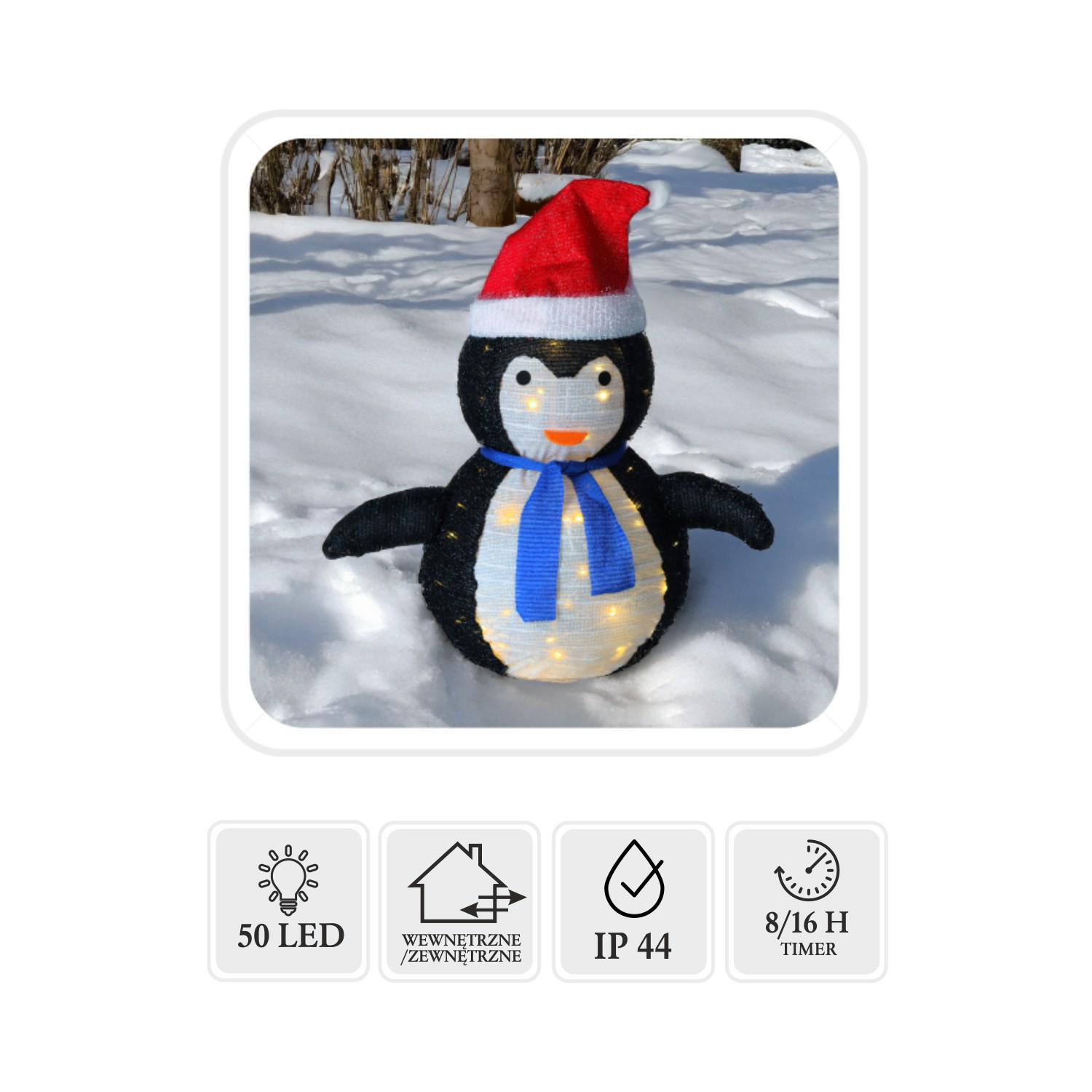 Оснащений 50 теплими світлодіодами, прозорим кабелем і класом герметичності IP44, пінгвін освітлить будь-який простір і створить затишну атмосферу. Завдяки вбудованому таймеру 8/16 годин він працює автоматично, заощаджуючи час і енергію 🌟.