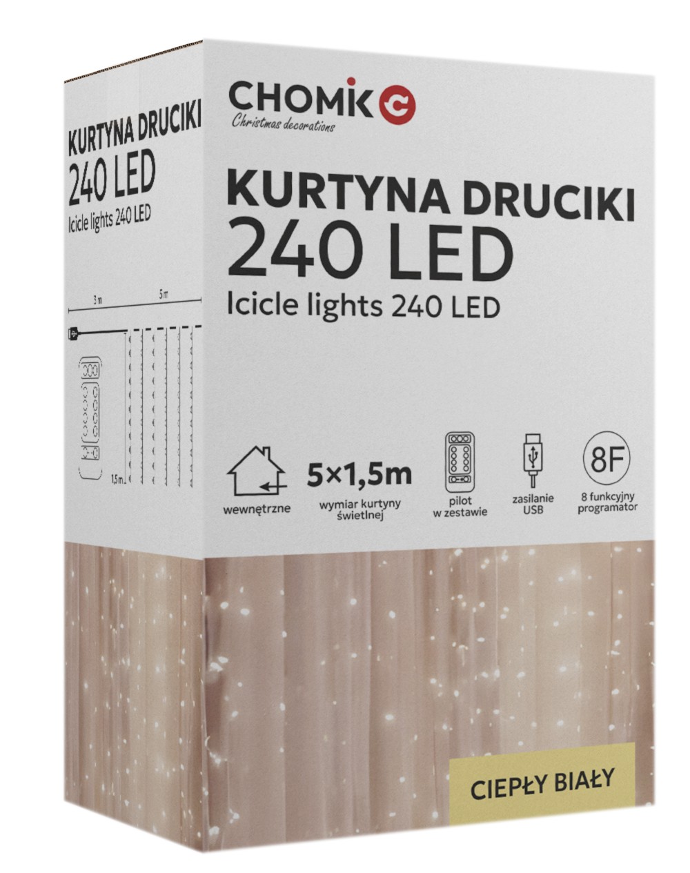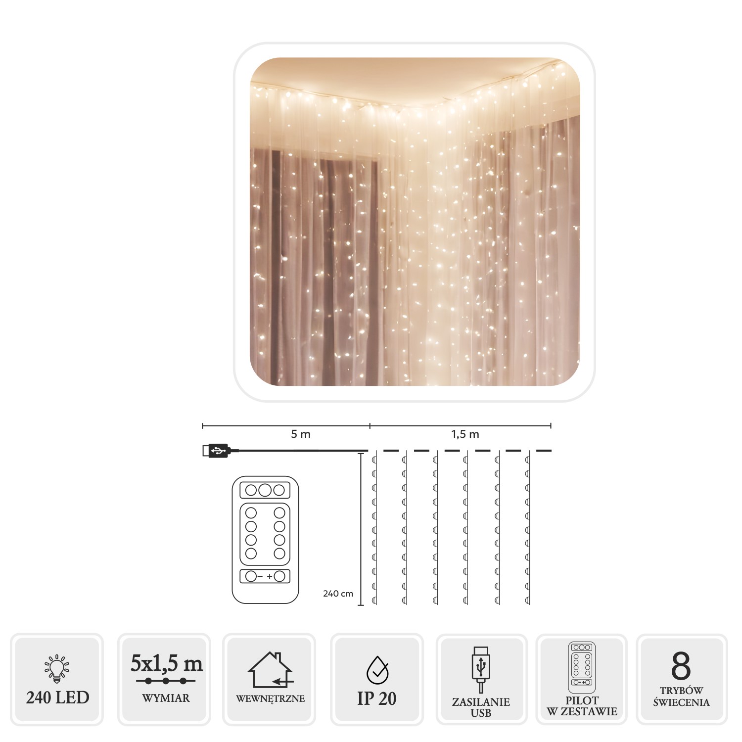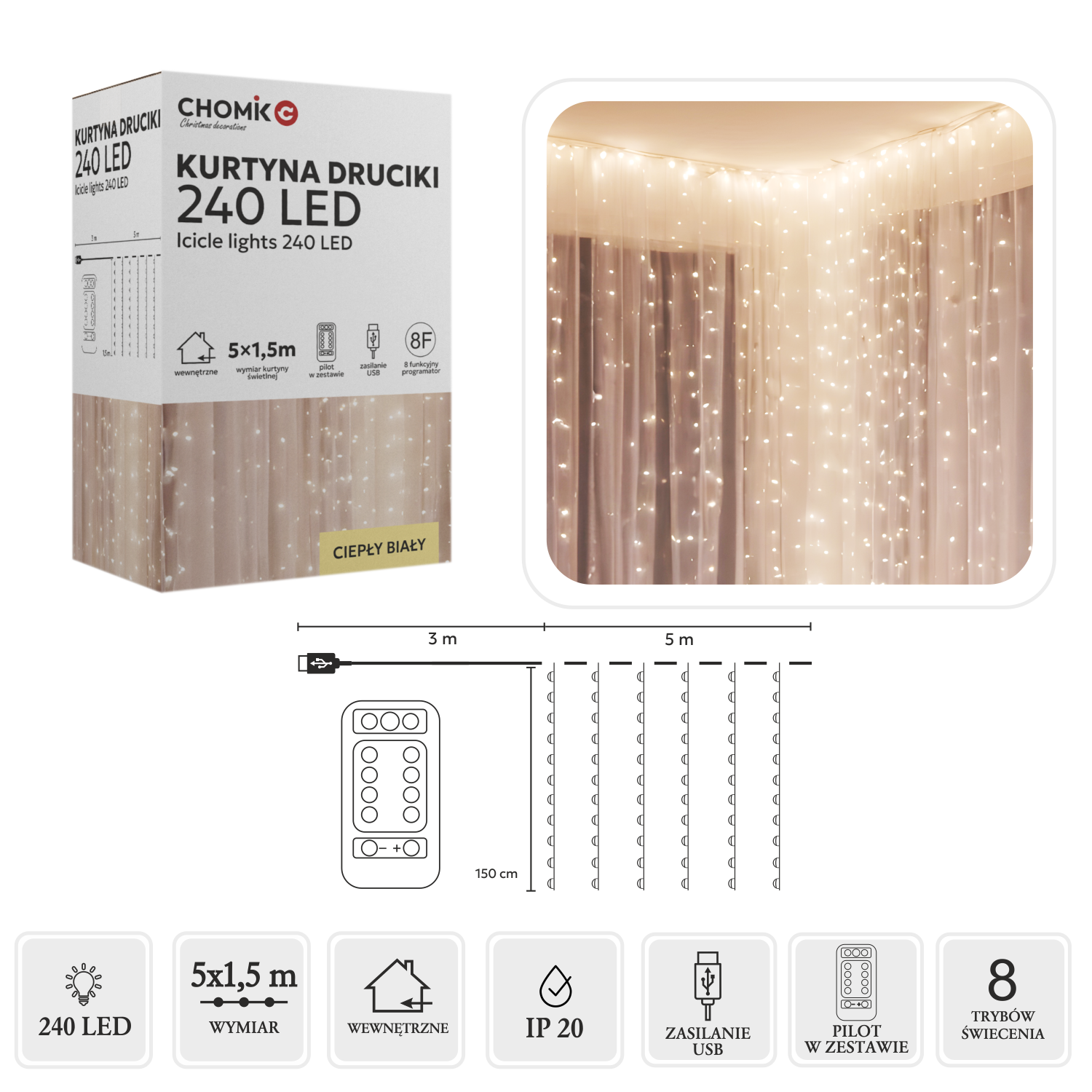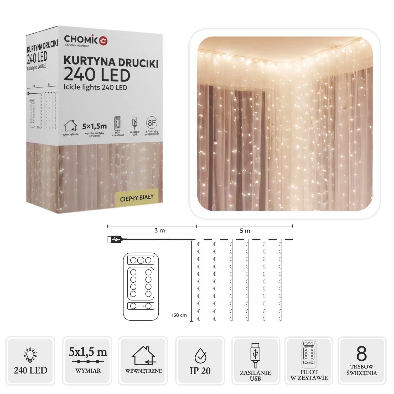СВІТЛОВА ЗАВІСА DRUCIKI 240L ТЕПЛО-БІЛА, 5 x 1,5 М, USB, З ПУЛЬТОМ ДИСТАНЦІЙНОГО КЕРУВАННЯ ✨