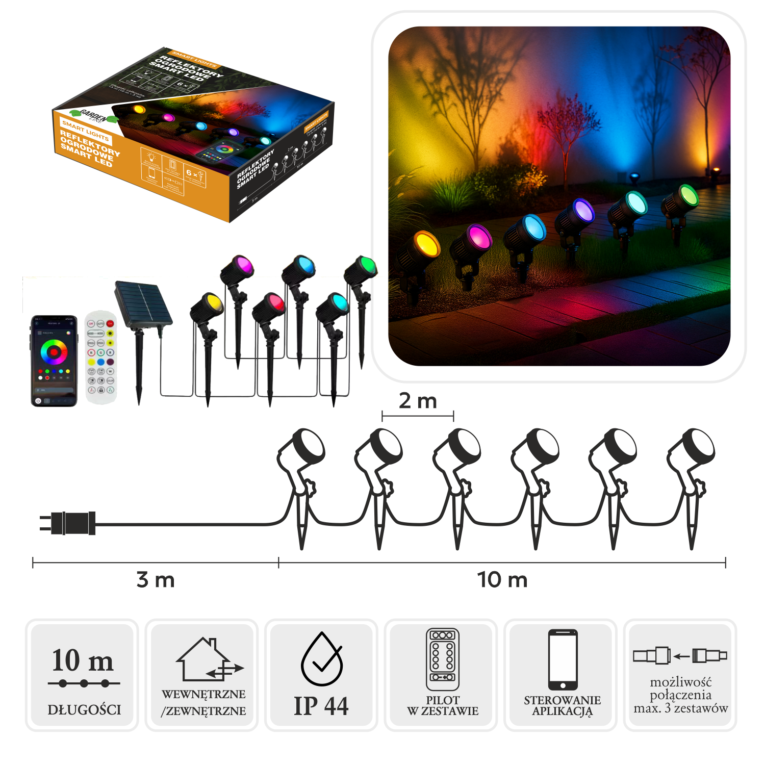 Створіть неймовірну ілюмінацію саду або тераси за допомогою прожекторів SMART LED! Набір містить 6 кольорових прожекторів RGB, які завдяки додатку «MAGIC-LANTERN» дозволяють керувати кольором, режимом і ефектом світла в режимі реального часу. 🌈📱