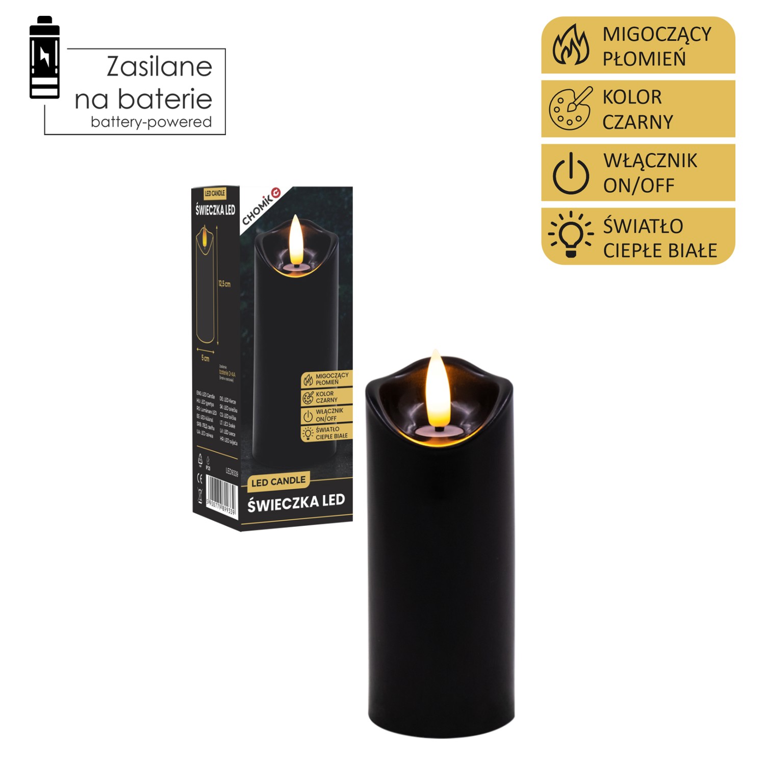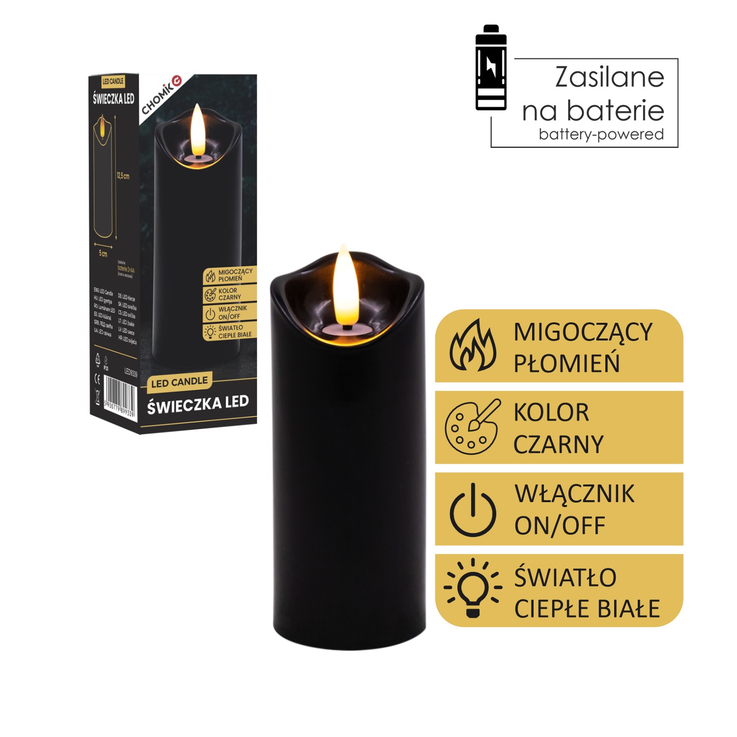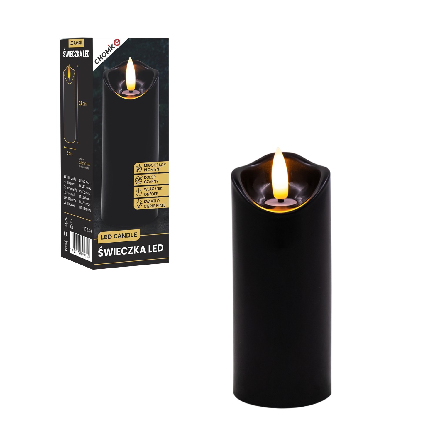 Пластикова світлодіодна свічка з мерехтливим полум’ям теплого білого кольору.