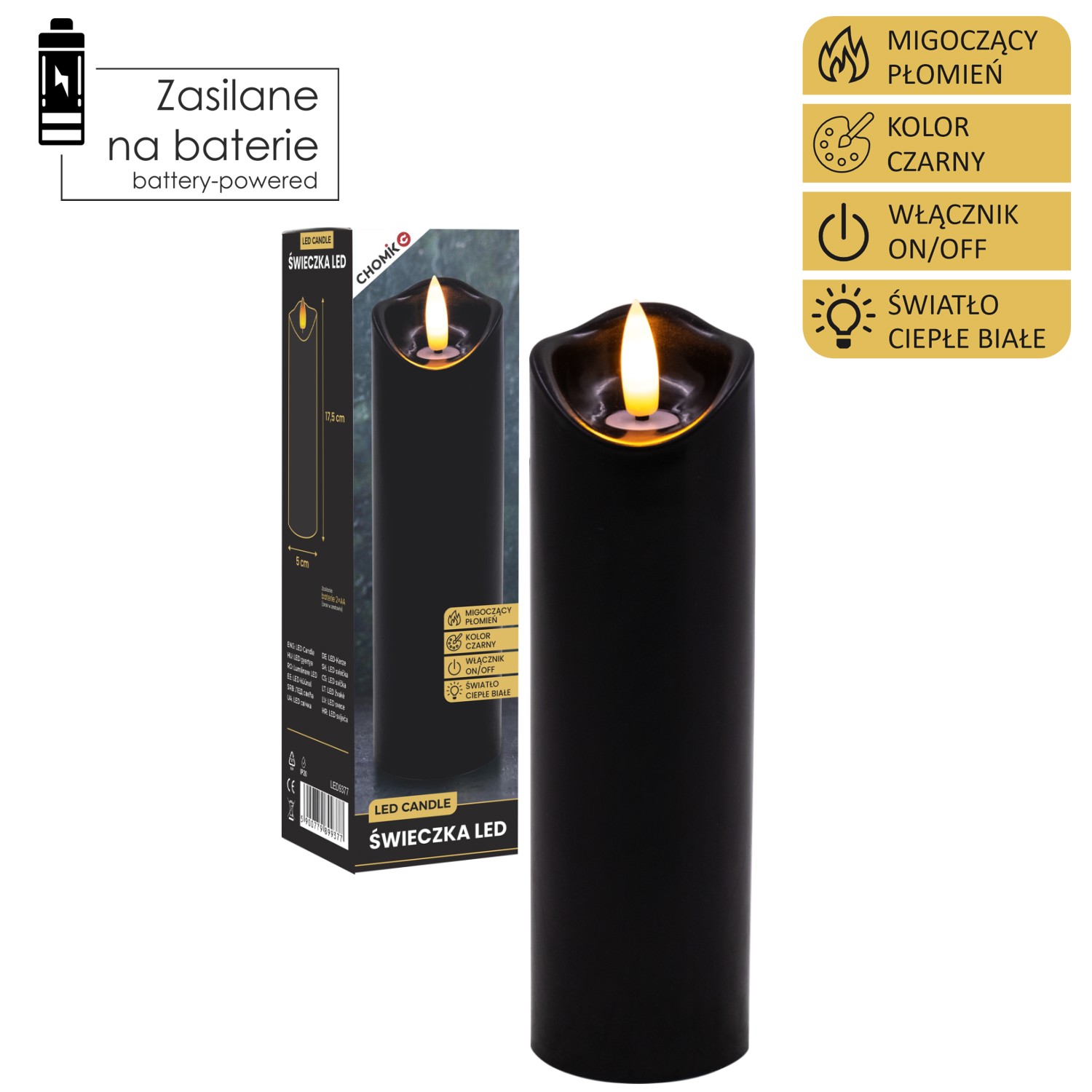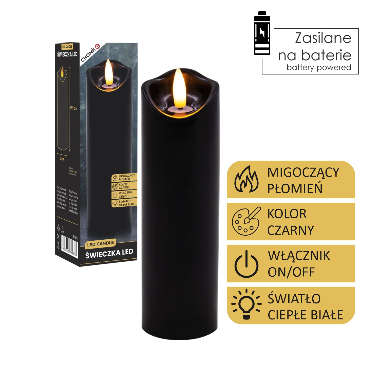 Пластикова світлодіодна свічка з мерехтливим полум'ям теплого білого кольору.Її можна використовувати як вставку для свічки на могилу, так і як прикрасу інтер'єру будинку.Живиться від двох батарейок типу АА (батарейки не входять до комплекту).Функція: Увімкнути/ВимкнутиКолір: чорний