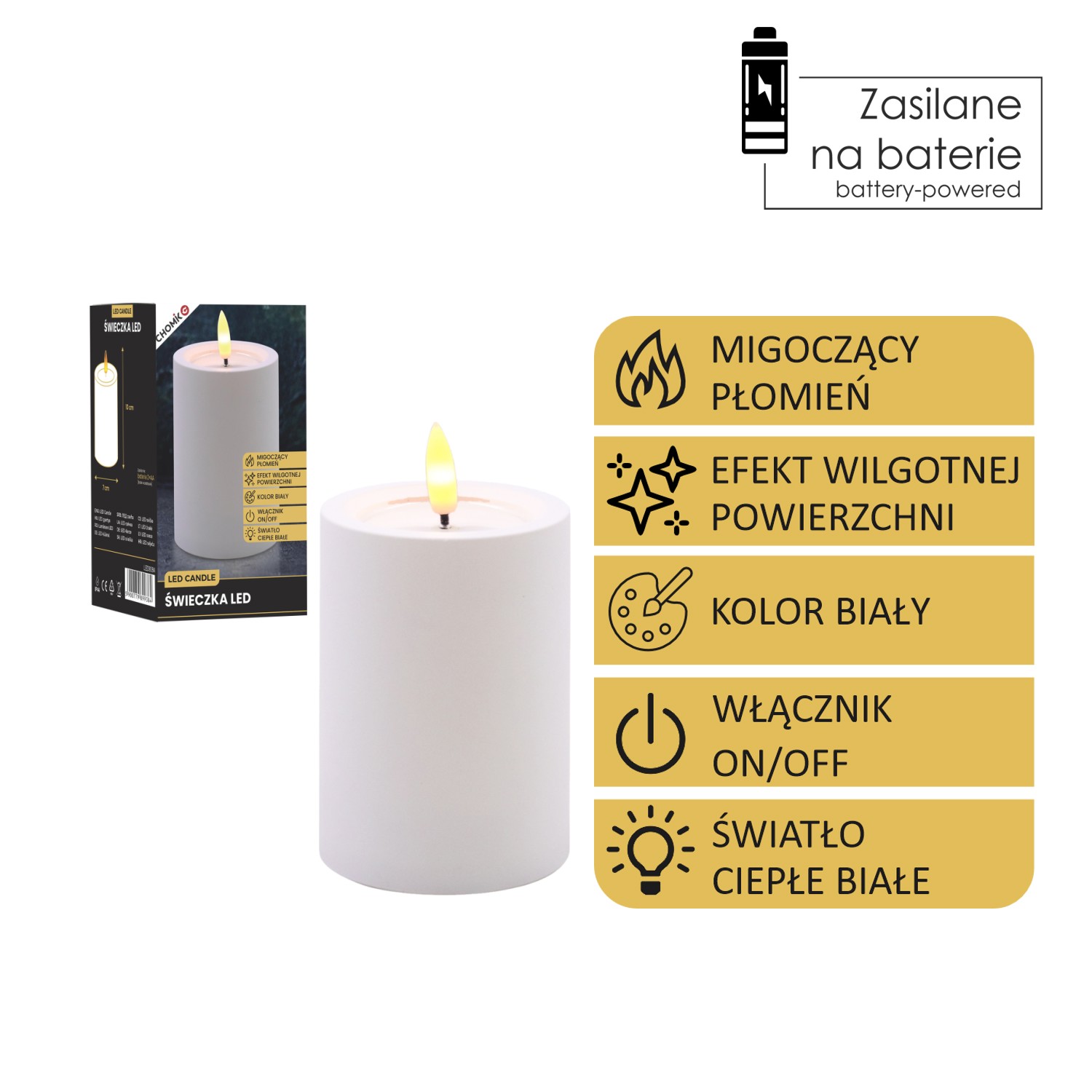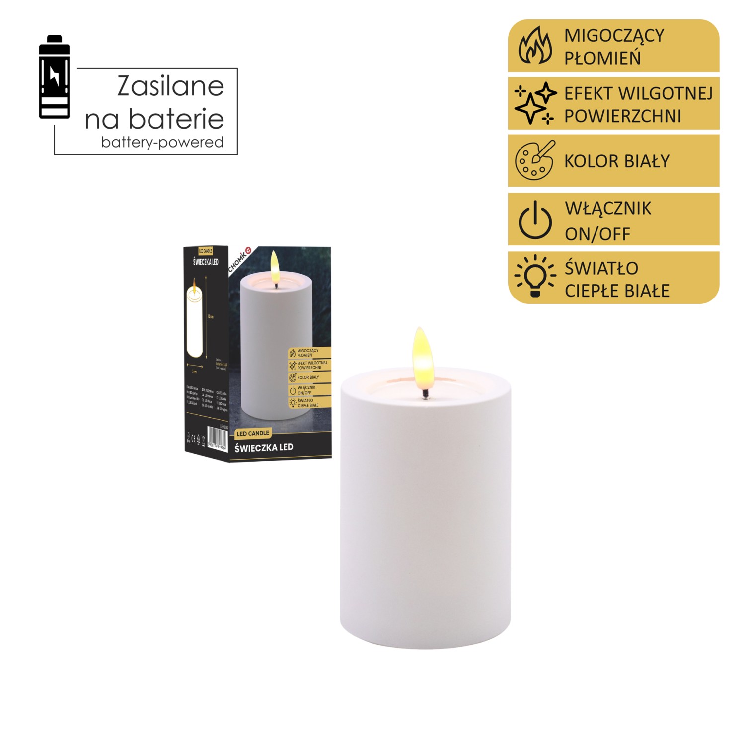 Пластикова світлодіодна свічка з мерехтливим полум’ям теплого білого кольору та ефектом вологої поверхні у верхній частині.