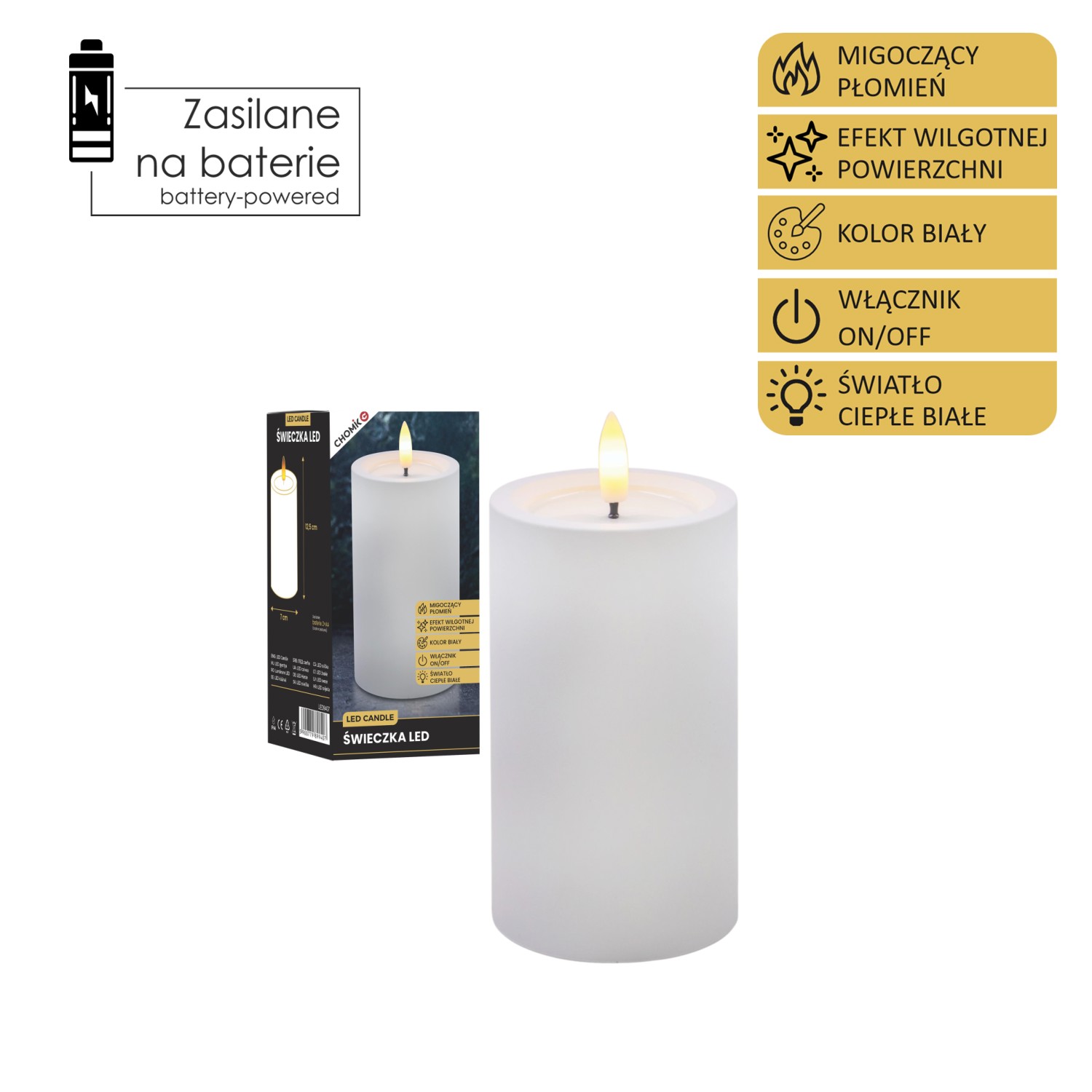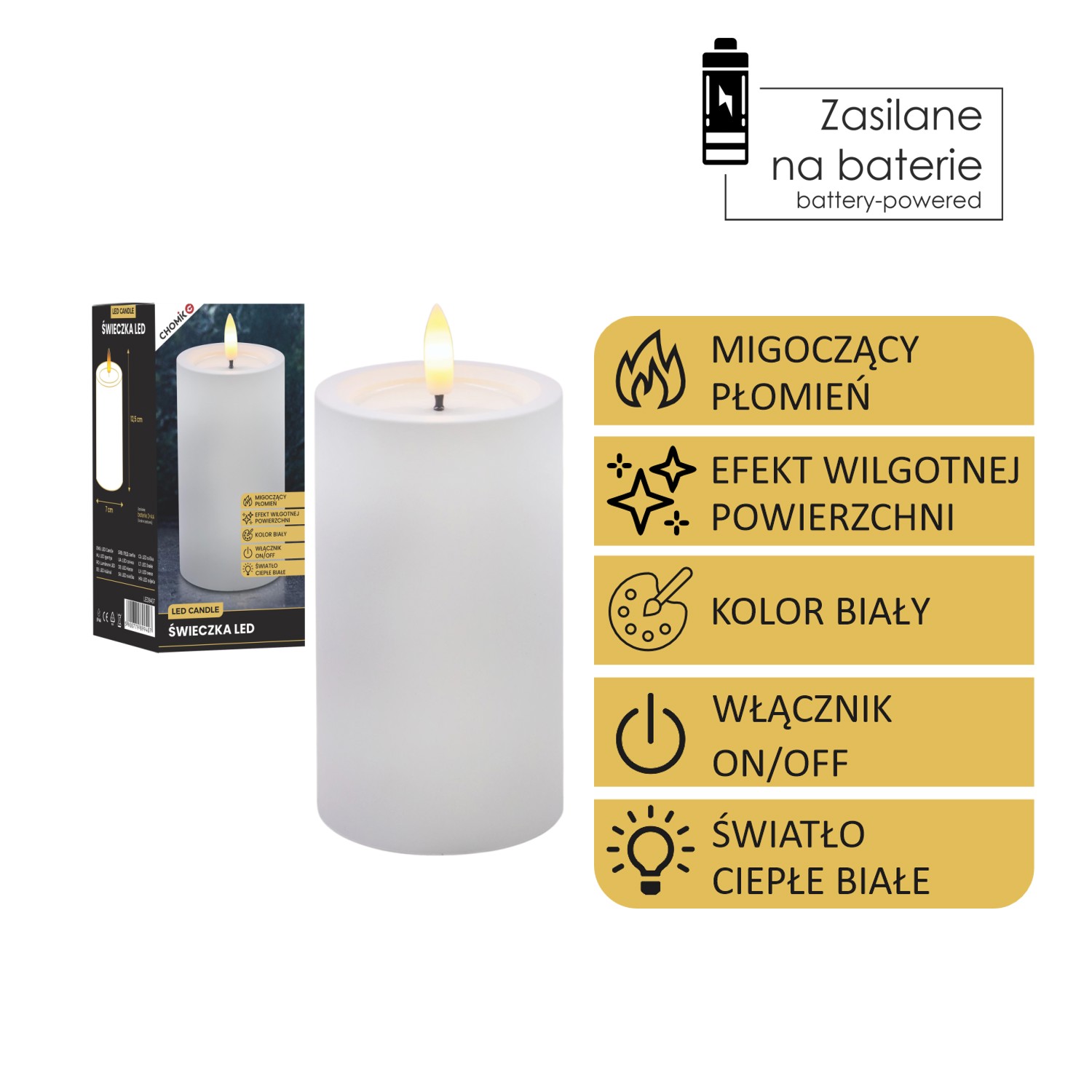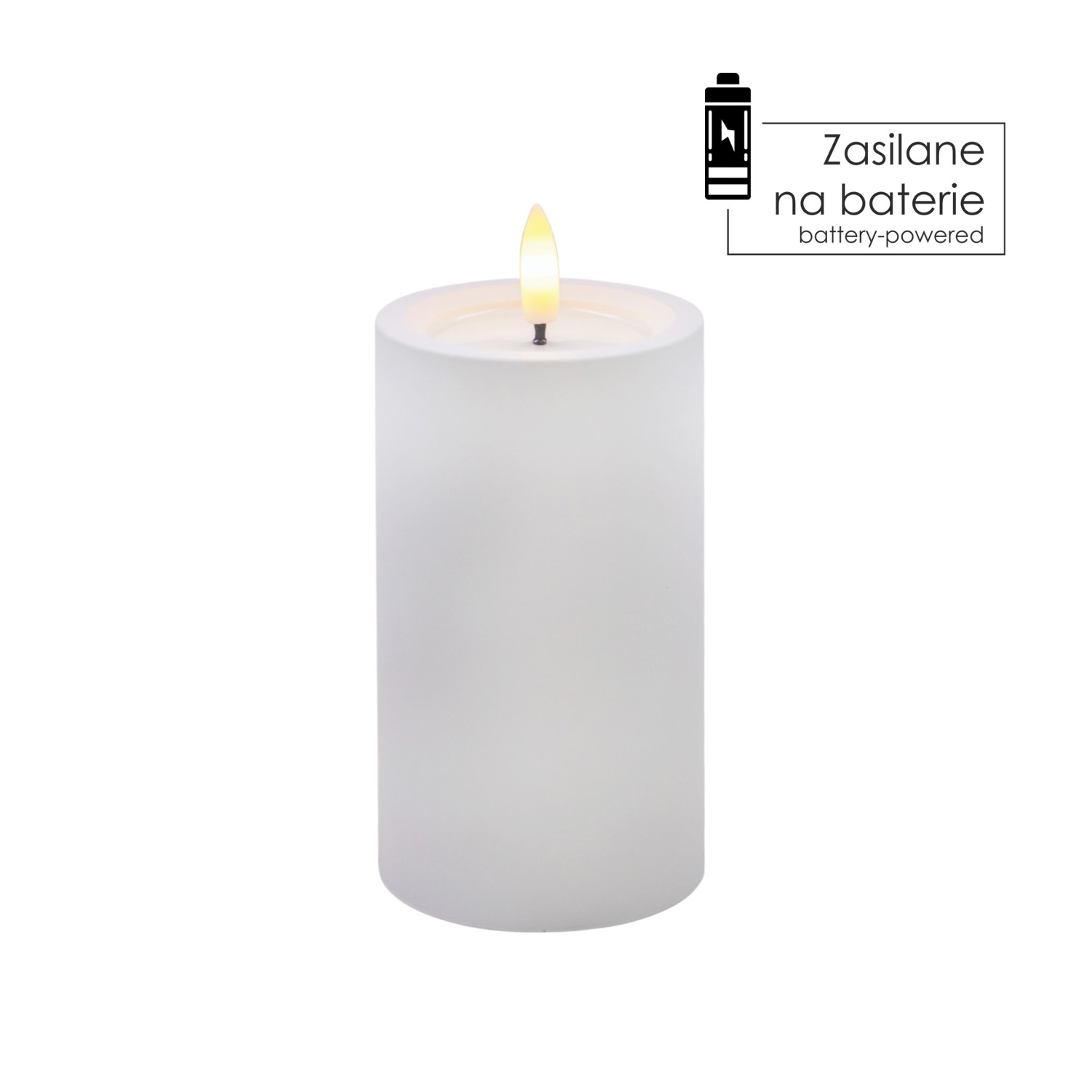 Пластикова світлодіодна свічка з мерехтливим полум’ям теплого білого кольору та ефектом вологої поверхні у верхній частині. Ідеально підходить для декорування інтер'єру, чудово впишеться в різні стилі.Живиться від двох батарейок типу АА (батарейки не входять до комплекту).Функція: Увімкнути/Вимкнути.Колір: білий
