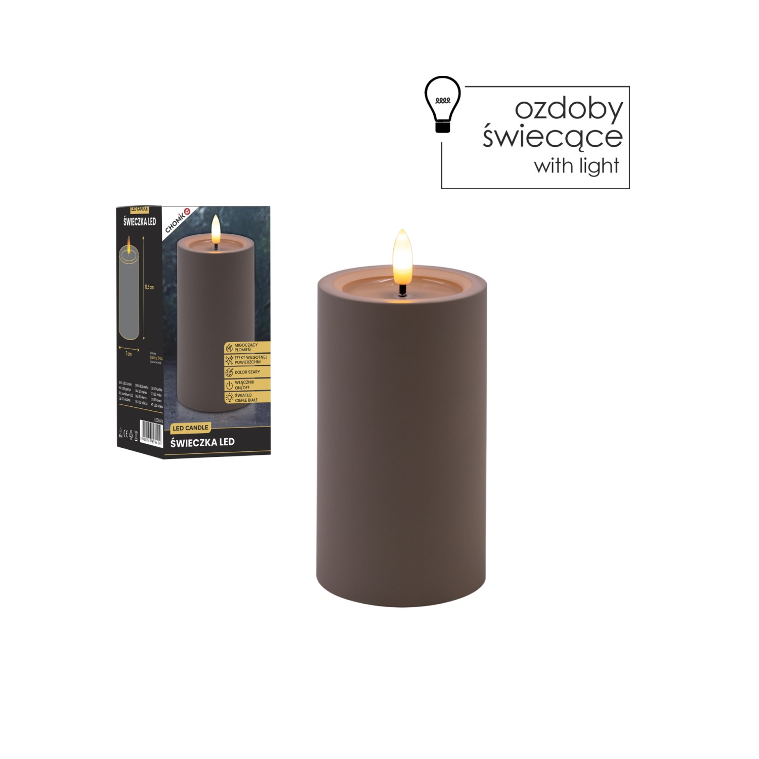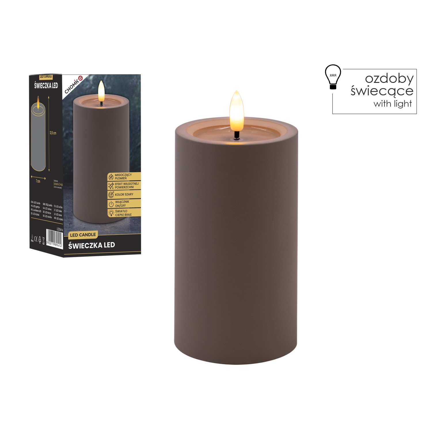 Пластикова LED-свічка з мерехтливим полум'ям теплого білого кольору та ефектом вологої поверхні у верхній частині. Ідеально підходить для декорування інтер'єрів, чудово вписується в різні стилі.Працює від двох батарейок типу AA (батарейки не входять до комплекту).Функція: увімкнення/вимкнення.Колір: сірий