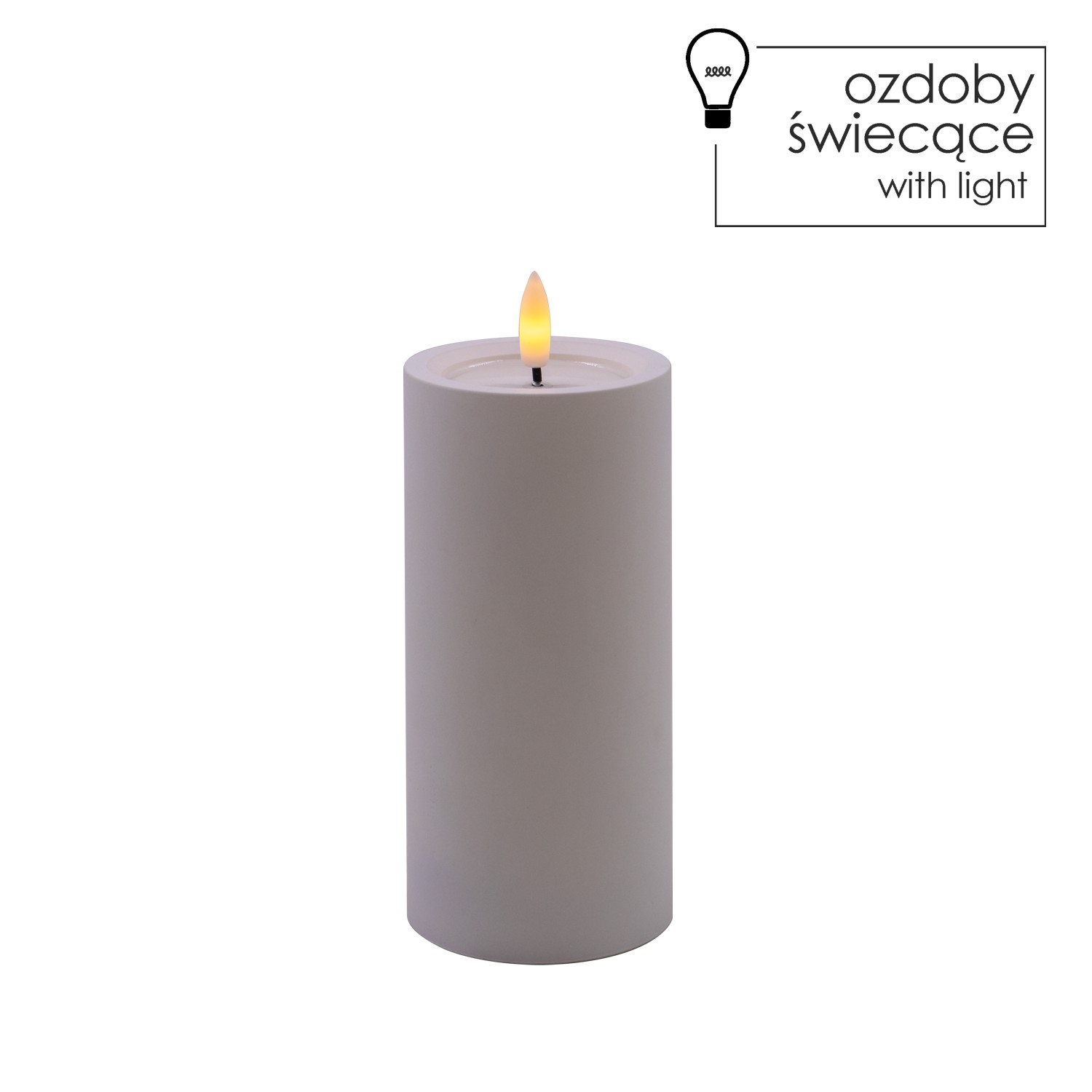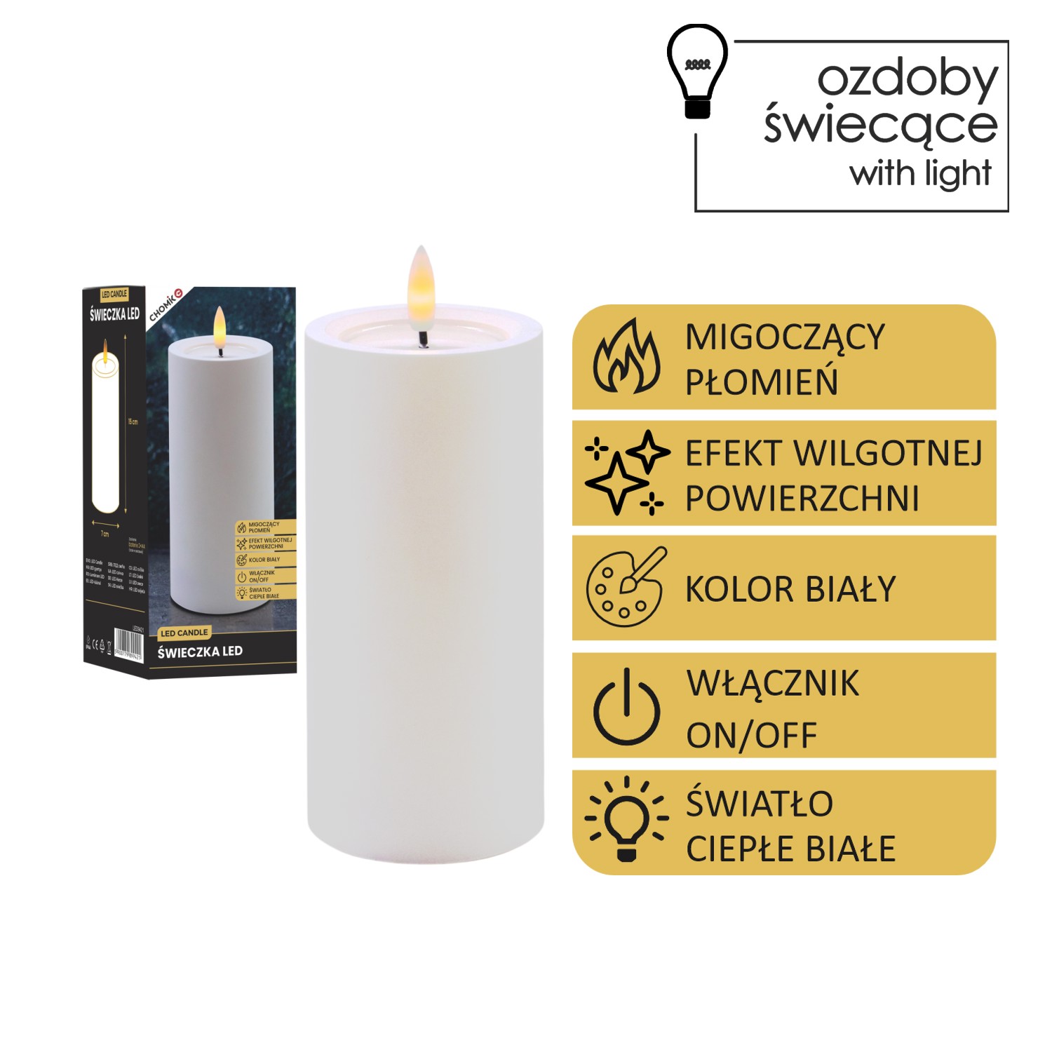Пластикова LED-свічка з мерехтливим полум'ям теплого білого кольору та ефектом вологої поверхні у верхній частині. Ідеально підходить для декорування інтер'єрів, чудово вписується в різні стилі.Живлення від двох батарейок типу AA (батарейки не входять до комплекту).Функція: увімкнення/вимкнення.Колір: білий