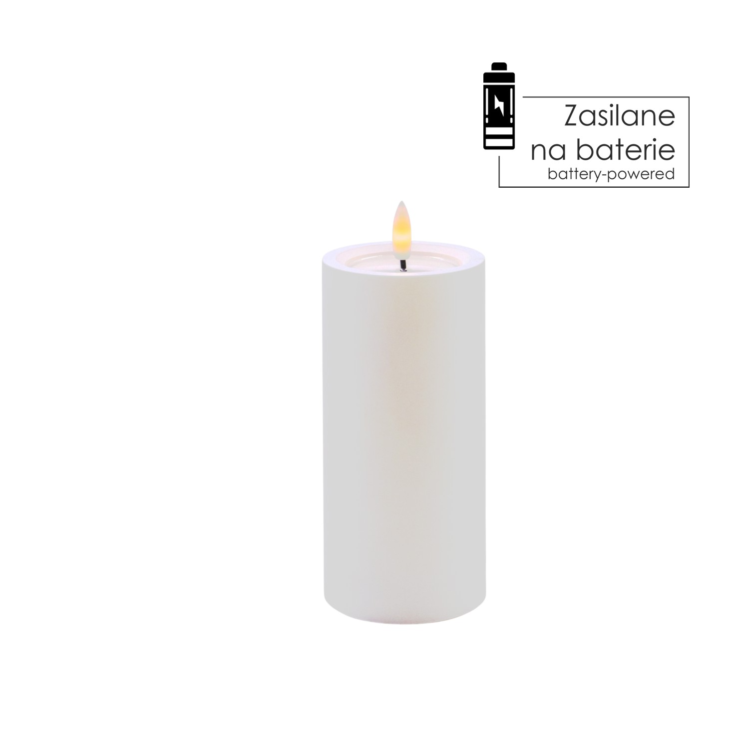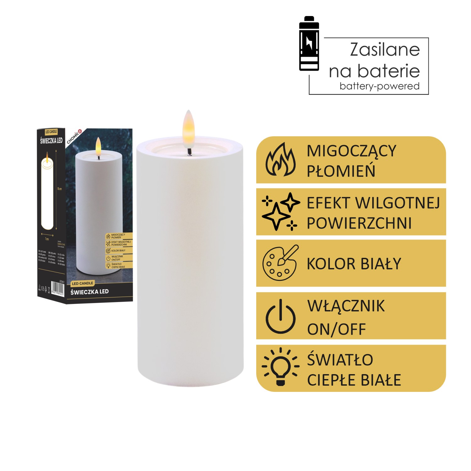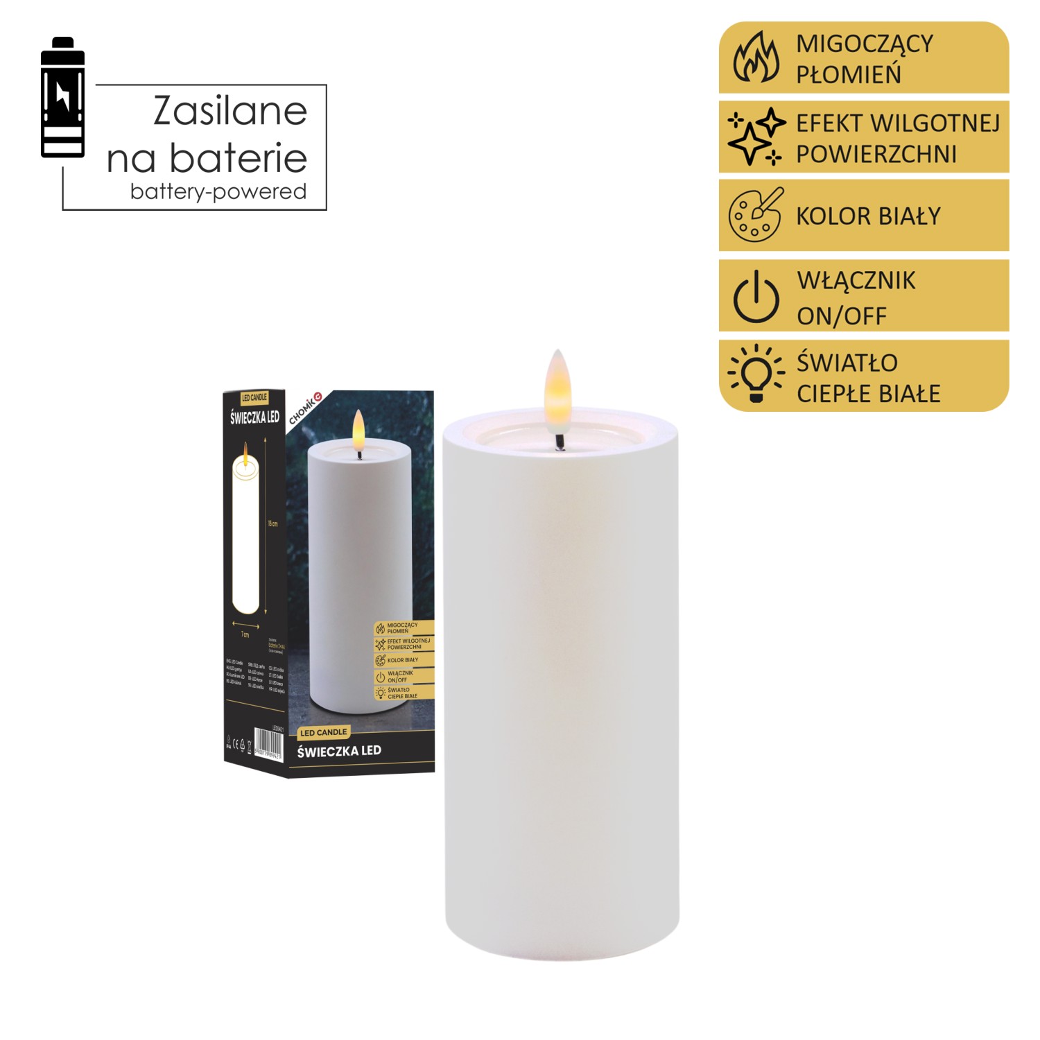 Пластикова світлодіодна свічка з мерехтливим полум’ям теплого білого кольору та ефектом вологої поверхні у верхній частині.