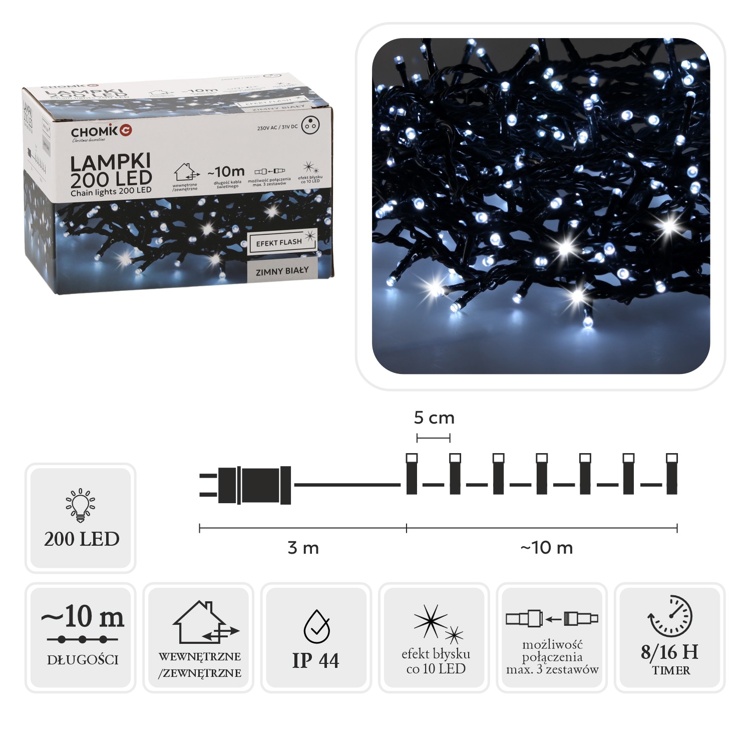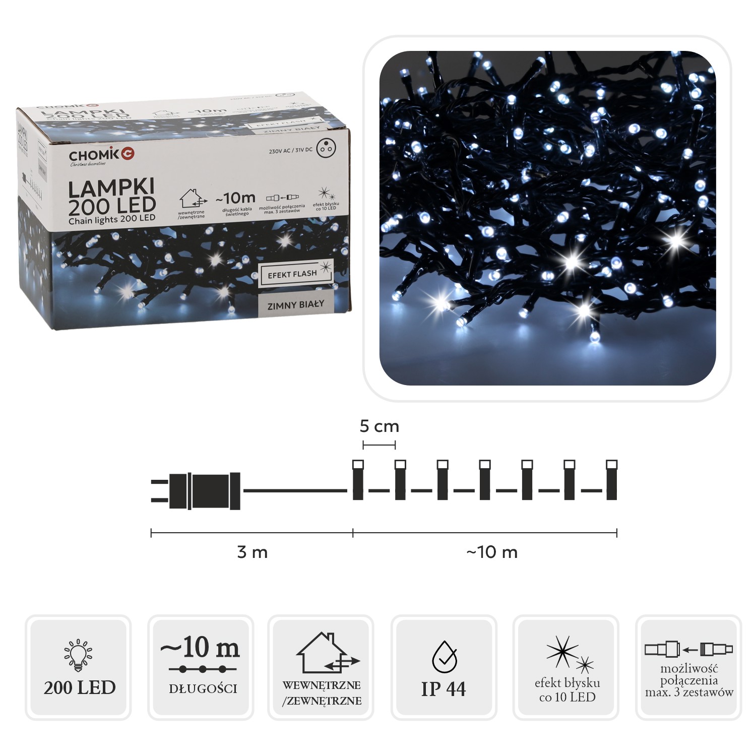 > кількість діодів: 200> колір діодів: холодний білий + холодний спалах > загальна довжина: ~ 13 м> довжина світлової частини: ~ 10 м> довжина шнура живлення: 3 м> колір ізоляції: зелений > колір трансформатора: чорний> Клас герметичності: IP44> Постійний програматор з функцією пам'яті та таймером 8/16 годин> Режим освітлення: постійний + спалах> Відстань між діодами: 5 см> Можливість підключення до 3 шт. світлових ланцюгів> Номінальна вторинна напруга: 31 В> Номінальна первинна напруга: 230 В> Перетин кабелю живлення: 1,5 мм> Сертифікат CE