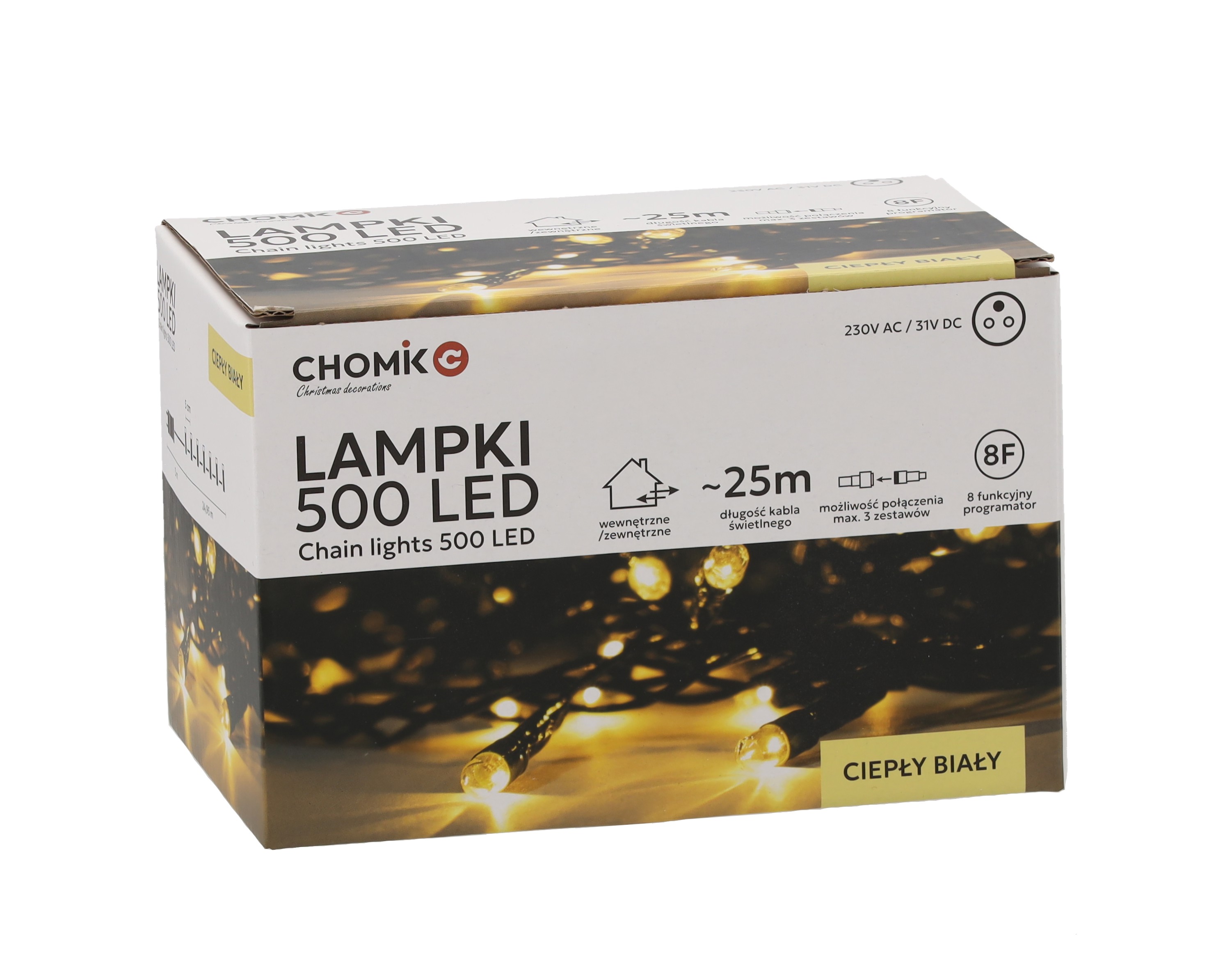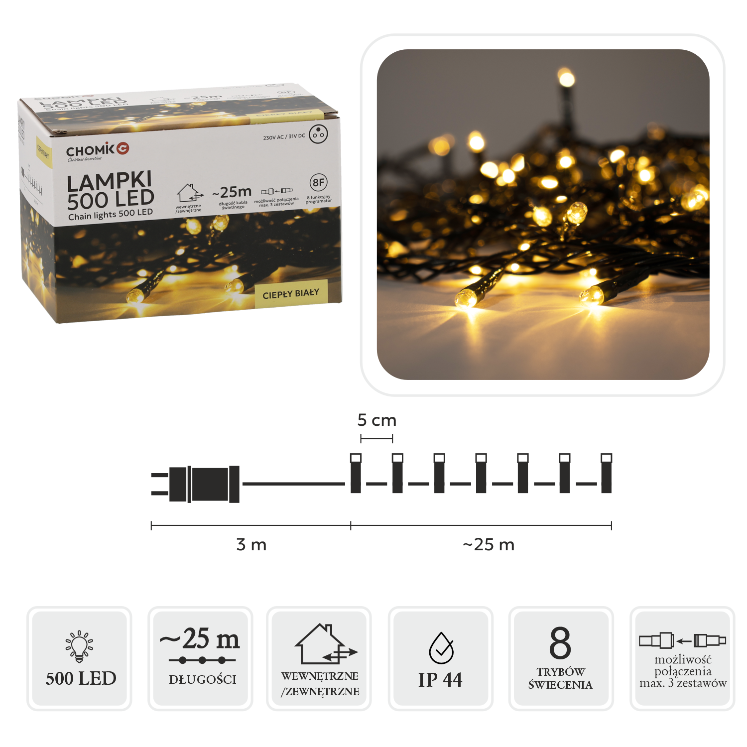 Мрієте про класичне, елегантне сяйво Різдва? Цей набір із 500 світлодіодних лампочок теплого білого кольору створить незабутню атмосферу – як у будинку, так і на вулиці 🎄✨ Завдяки великій довжині та інтелектуальним функціям управління це ідеальне рішення для будь-якого святкового проекту!