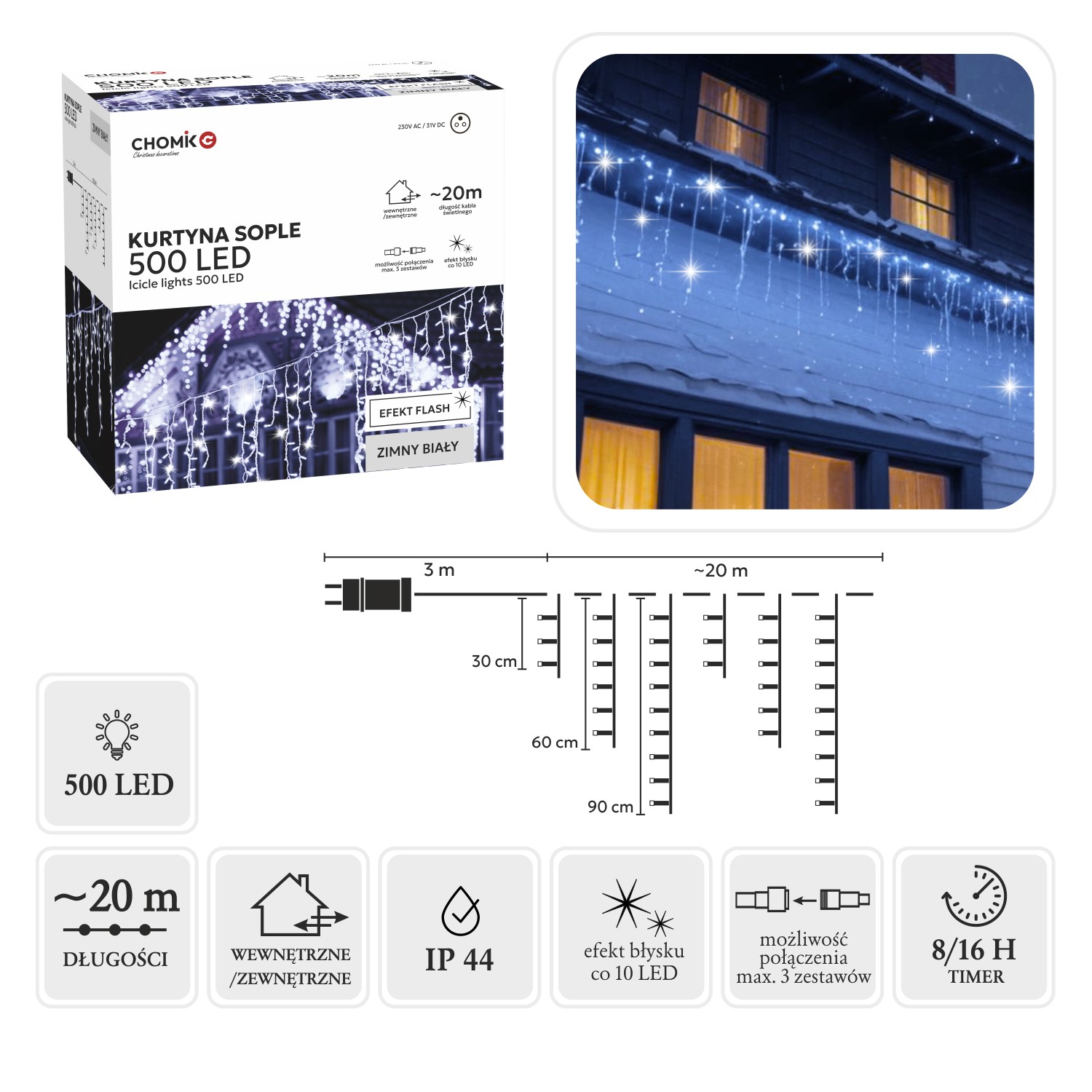 > кількість діодів: 500L> колір діодів: холодний білий + холодний флеш > загальна довжина: ~ 23 м> довжина світлової частини: ~ 20 м> довжина шнура живлення: 3 м> колір ізоляції: білий> колір трансформатора: чорний> клас герметичності: IP44> Постійний програматор з функцією пам'яті та таймером 8/16 годин> режим освітлення: постійний + миготливий> довжина бурульок: 30/70/40/60 см> кількість бурульок: 100> відстань між діодами: 10 см> можливість підключення до 3 шт. світлових ланцюгів> номінальна вторинна напруга: 31 В> номінальна первинна напруга: 230 В> перетин живильного кабелю: 1,5 мм> сертифікат CE