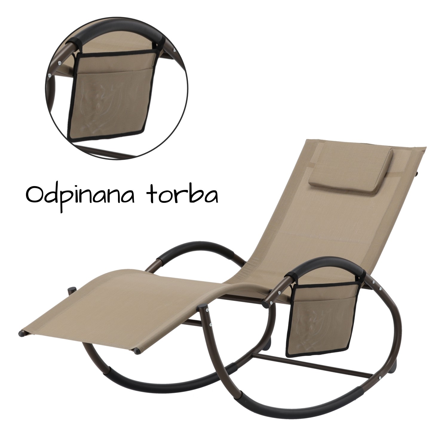Стильний і зручний садовий шезлонг-гойдалка коричневого кольору, оснащений практичною кишенею. Ідеально підходить для відпочинку в саду або на терасі.