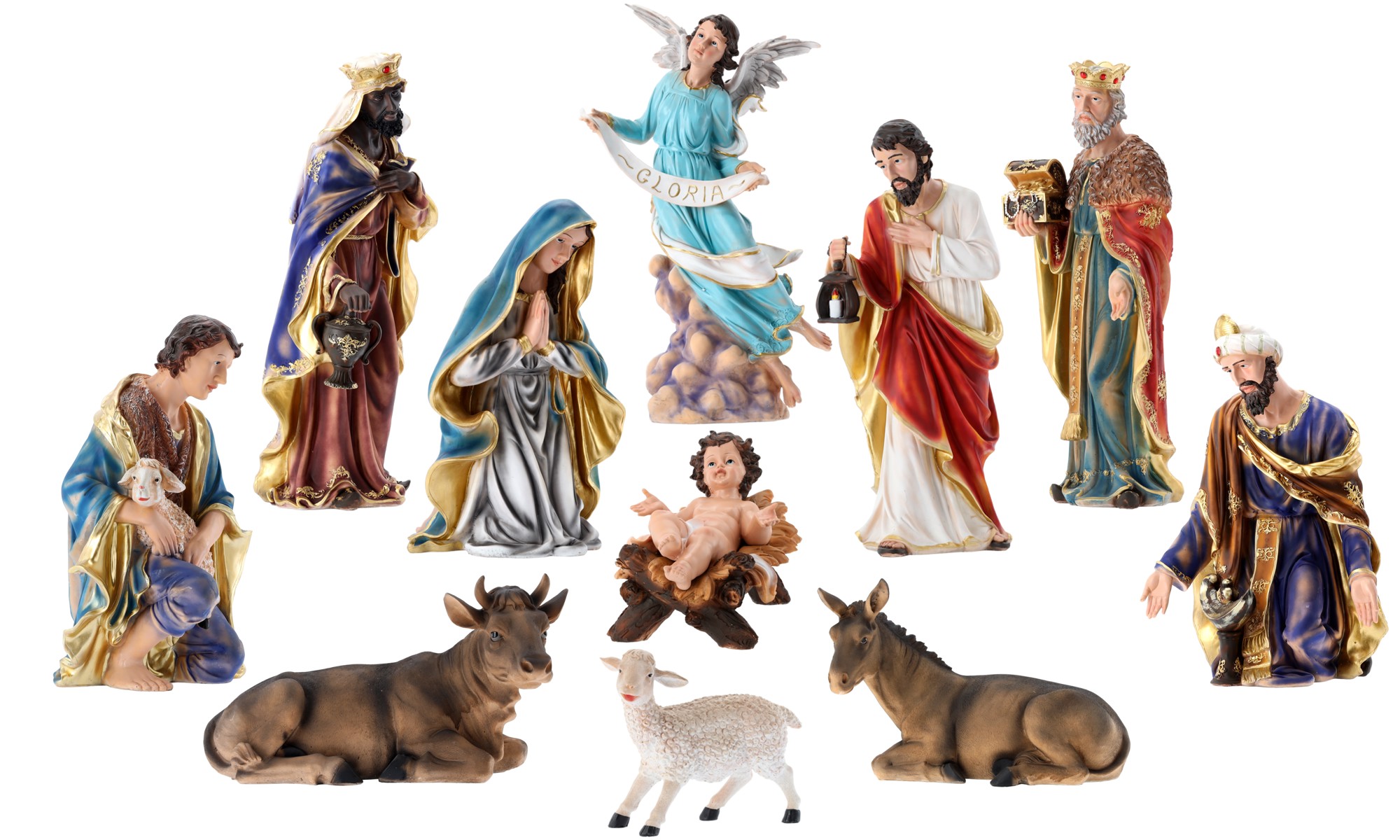 (розміри в см – ширина × довжина × висота)✔️ Святий Йосип – 33 × 38 × 92✔️ Свята Марія – 38 × 37 × 64✔️ Дитятко Ісус – 35 × 22 × 25✔️ Ангел – 24 × 43 × 88✔️ Король – 25 × 44 × 90✔️ Король – 31 × 42 × 90✔️ Король – 36 × 44 × 67✔️ Пастух – 29 × 36 × 60✔️ Осел – 21 × 50 × 29✔️ Вівця – 20 × 40 × 28✔️ Віл – 11 × 29 × 25