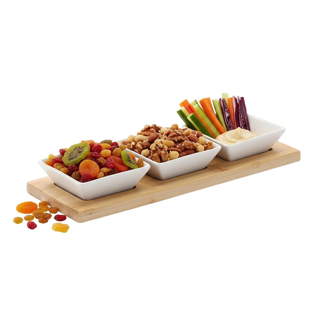 Якщо ви любите дивувати своїх гостей незвичайними закусками, цей набір саме для вас. Набір складається з трьох порцелянових мисок місткістю 90 мл кожна, трьох ложечок і бамбукової дошки з виїмками для мисок. Дошка забезпечує стабільність і легкість перенесення набору, а також додає йому елегантності та природності.