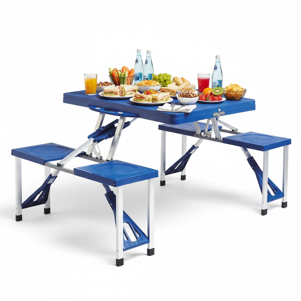 Готовий до будь-якої подорожі? Цей розкладний туристичний столик синього кольору — це Ваш мобільний центр відпочинку та комфорту! Ідеально підходить для пікніків, кемпінгу, поїздок на озеро або відпочинку в саду — розкладається за кілька секунд і готовий до використання! 🧺