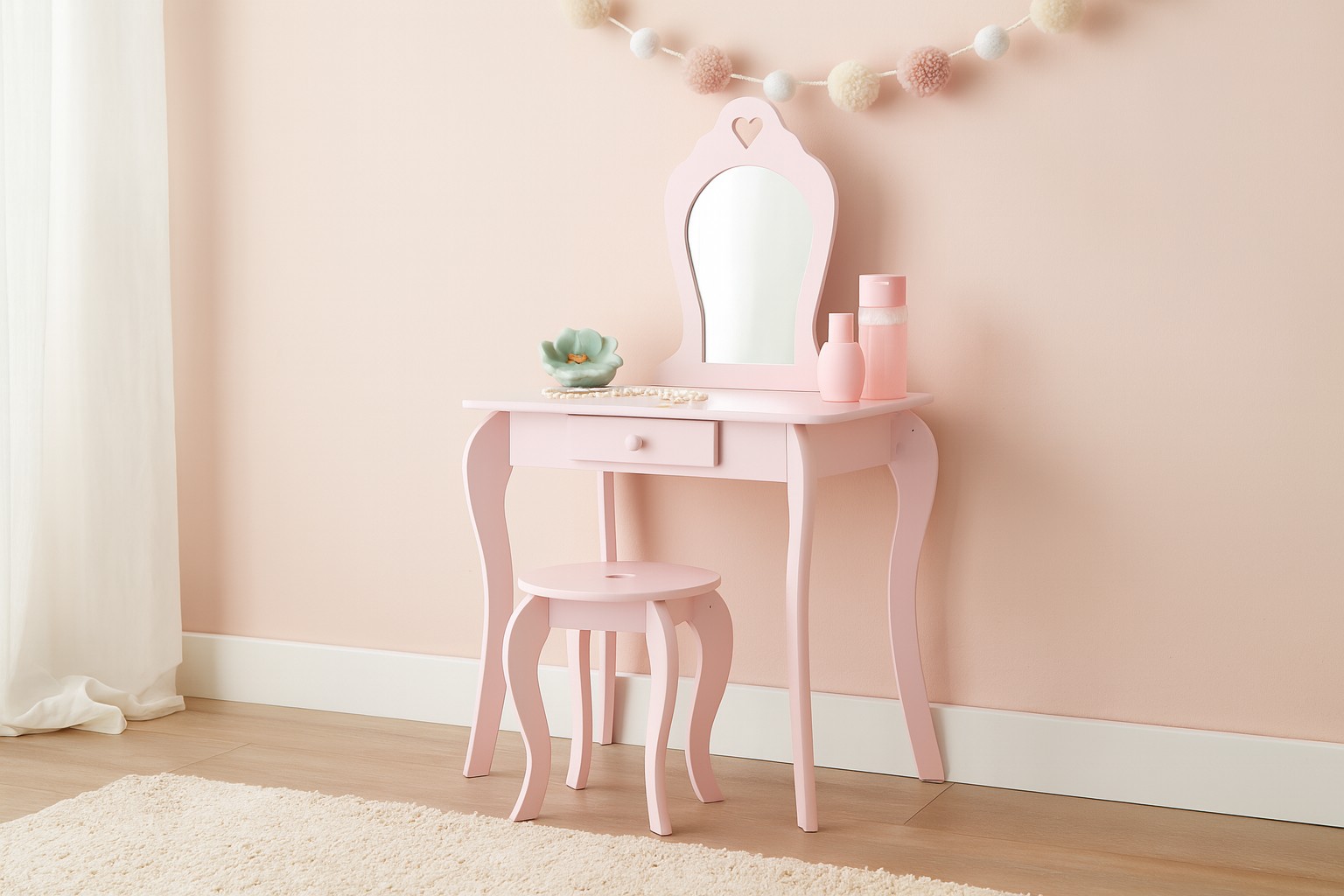 Оснащена дзеркалом у формі сердечка ❤️, місткою шухлядою 📦 і зручним табуретом 🪑, вона стане улюбленим предметом меблів у кімнаті кожної маленької леді 👧. Туалетний столик не тільки вражає своїм зовнішнім виглядом 🎀, але й вчить порядку 🧹 і дає дитині простір для ігор 🎨 та розвитку уяви 🌟.