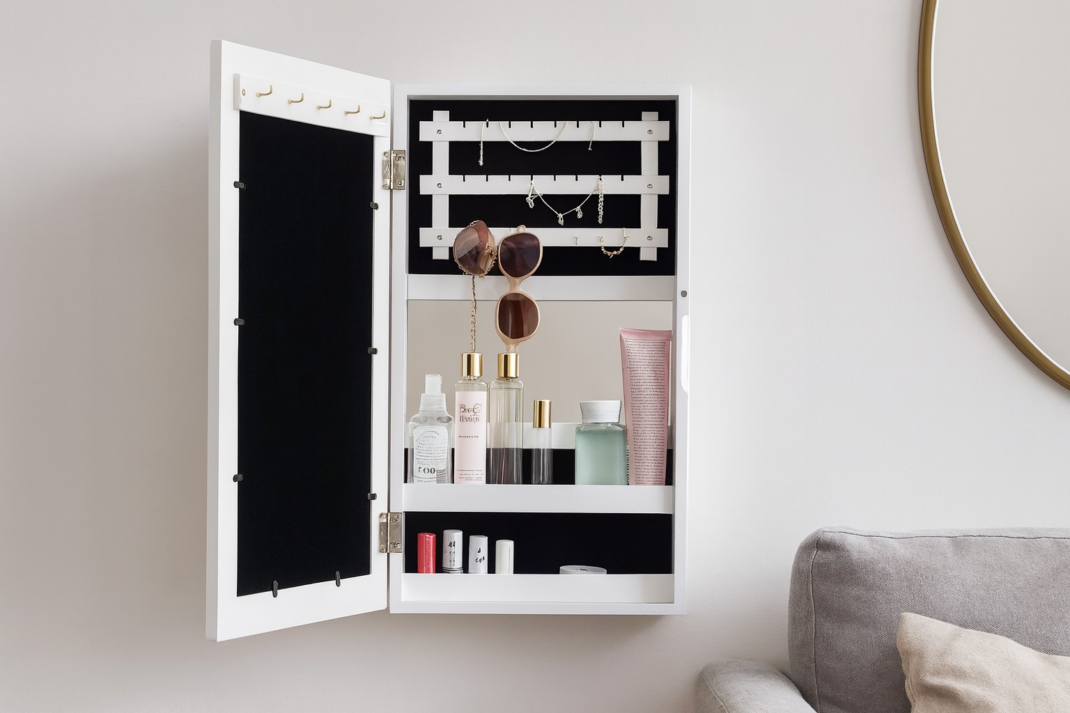 Шафка для прикрас ✨ — це поєднання функціональності та елегантності 🌸. Завдяки м'якому внутрішньому оздобленню 💎 ваші скарби завжди будуть у безпеці 🔒 та красиво виставлені на показ 👑. Вбудоване дзеркало 🪞 дозволяє за кілька хвилин перевірити, як виглядають аксесуари 💍, а місця для фотографій 🖼 додадуть особистого характеру 💖. Це продукт, який порадує 🎁 не тільки як практичний предмет меблів, але й як унікальна декорація 🌺.