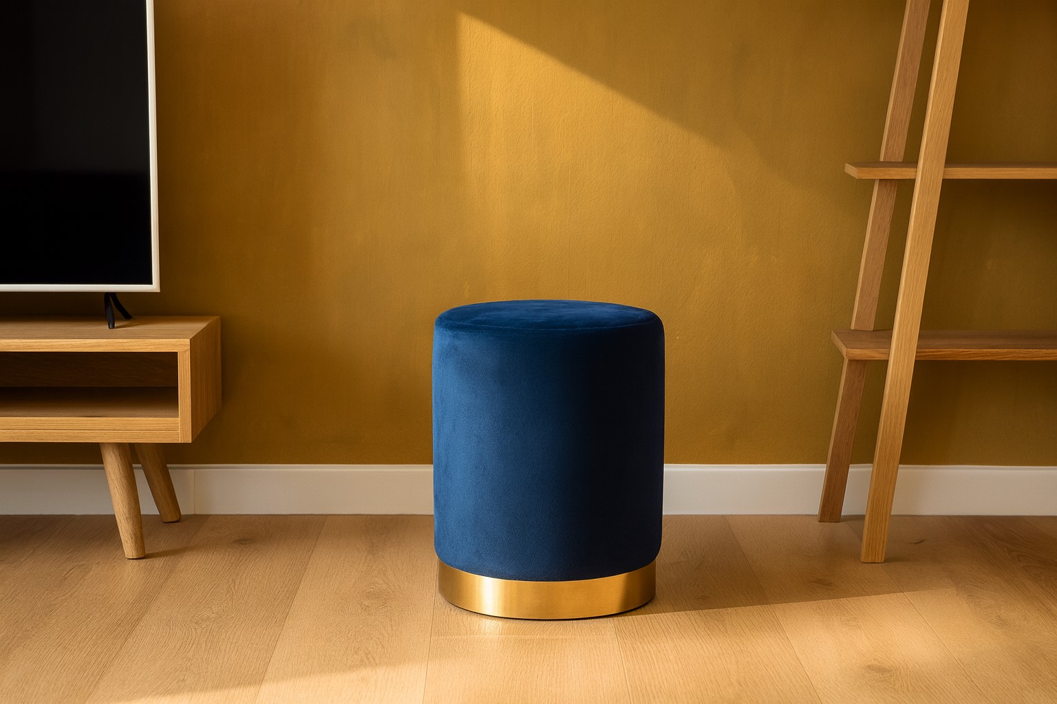 🌟 Стильний пуф синього кольору із золотистою облямівкою ✨ – маленький, але з характером! Ідеально підходить як сидіння 🪑, підніжка 🦶 або декоративний елемент 🏡 завдяки компактним розмірам 📏 і витривалості до 80 кг 💎.