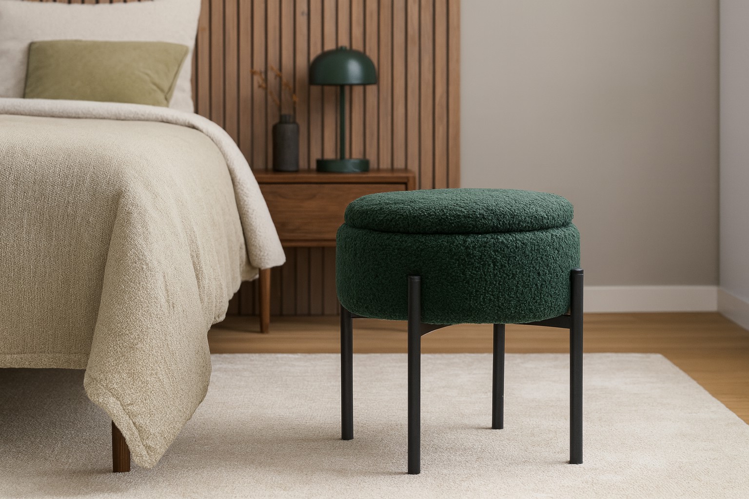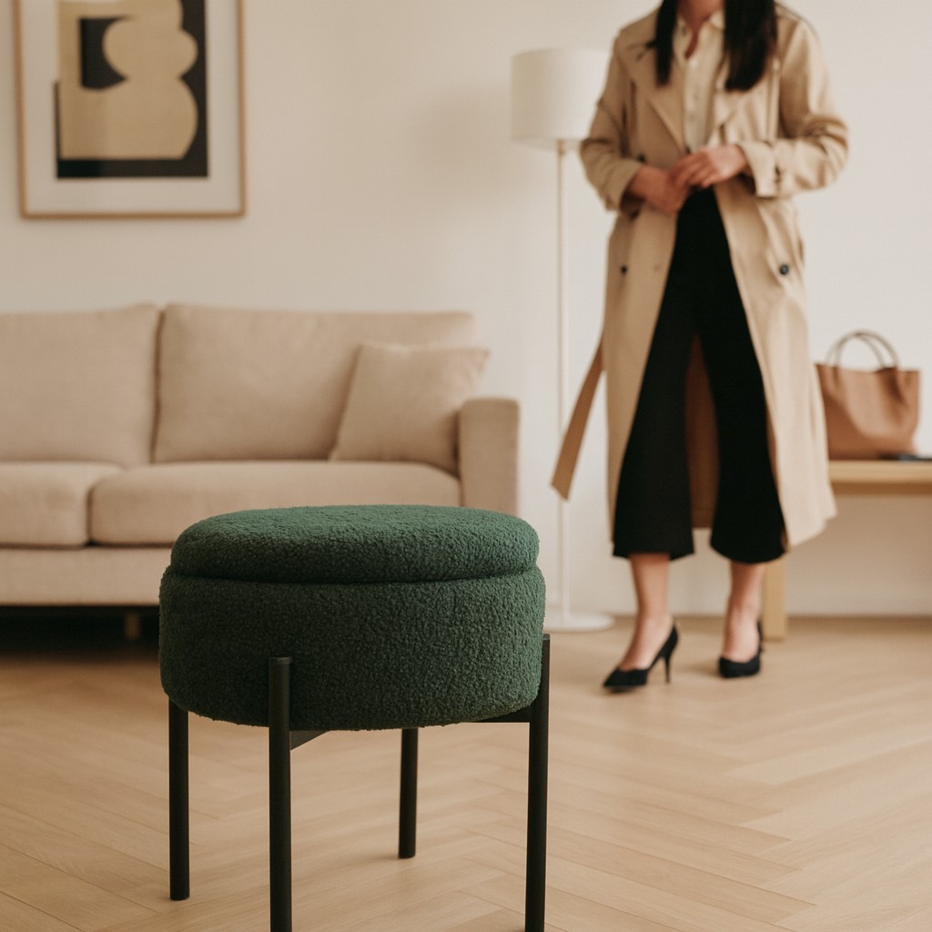 ✅ Найважливіші характеристики та переваги:• 🌿 Сучасний дизайн – зелений колір додає інтер'єру свіжості та стилю.• 🦵 Стабільні металеві ніжки – гарантія міцності та елегантного вигляду.• 📏 Компактний розмір – легко переноситься, поміститься навіть у невеликих приміщеннях.• 🪑 Функціональність – може служити сидінням, підніжкою або декоративним акцентом.• 🏡 Універсальне застосування – підходить для вітальні, спальні, гардеробної або передпокою.