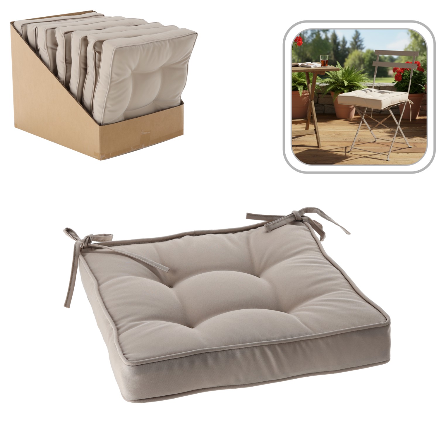 Вона виготовлена з поліестеру, стійкого до бризок, і оснащена кріпильними шнурками, які забезпечують стабільність. Товщина 6 см і поліестерне волокно всередині гарантують м'якість навіть під час тривалого сидіння 🪑