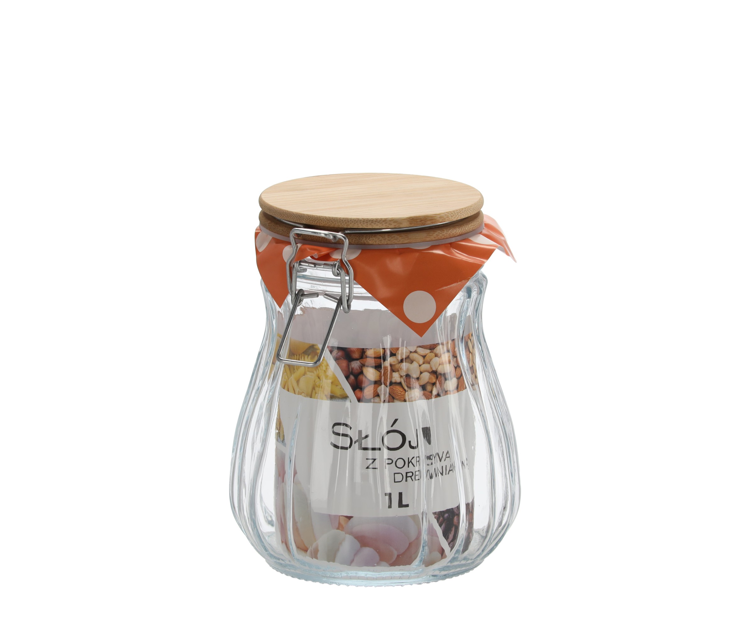 Скляна банка місткістю 1 л – ідеальний варіант для зберігання меду, джемів, спецій та інших дрібних продуктів. Оснащена дерев'яною кришкою, вона забезпечує герметичність і свіжість продуктів, що зберігаються. Завдяки своєму елегантному зовнішньому вигляду вона ідеально підходить для будь-якої кухні, комори або як прикраса столу.
