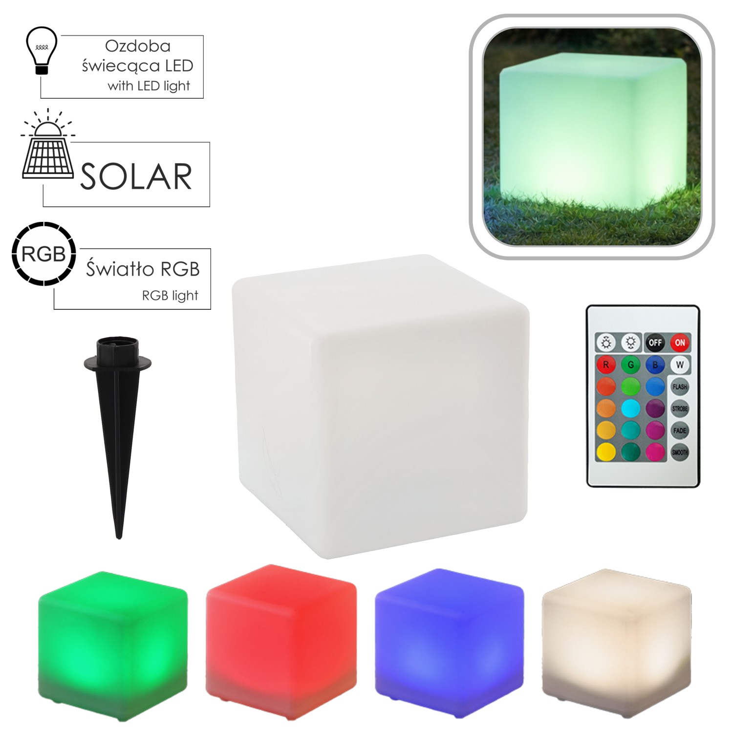 Кількість діодів: 4 світлодіодиКолір діодів: 2 світлодіоди теплого білого кольору + 2 RGB, що змінюють колірРозміри: 40 x 40 x 41 смМатеріал: поліетиленКлас герметичності: IP65Сонячна панель: 5 В 250 мА полікристалічний кремнійАкумулятор: 3,7 В 18650 1500 мАг Li-ONЧас заряджання: 7-8 годинЧас роботи: 6-7 годУ комплекті: пульт дистанційного керування + штифт для кріплення в землі