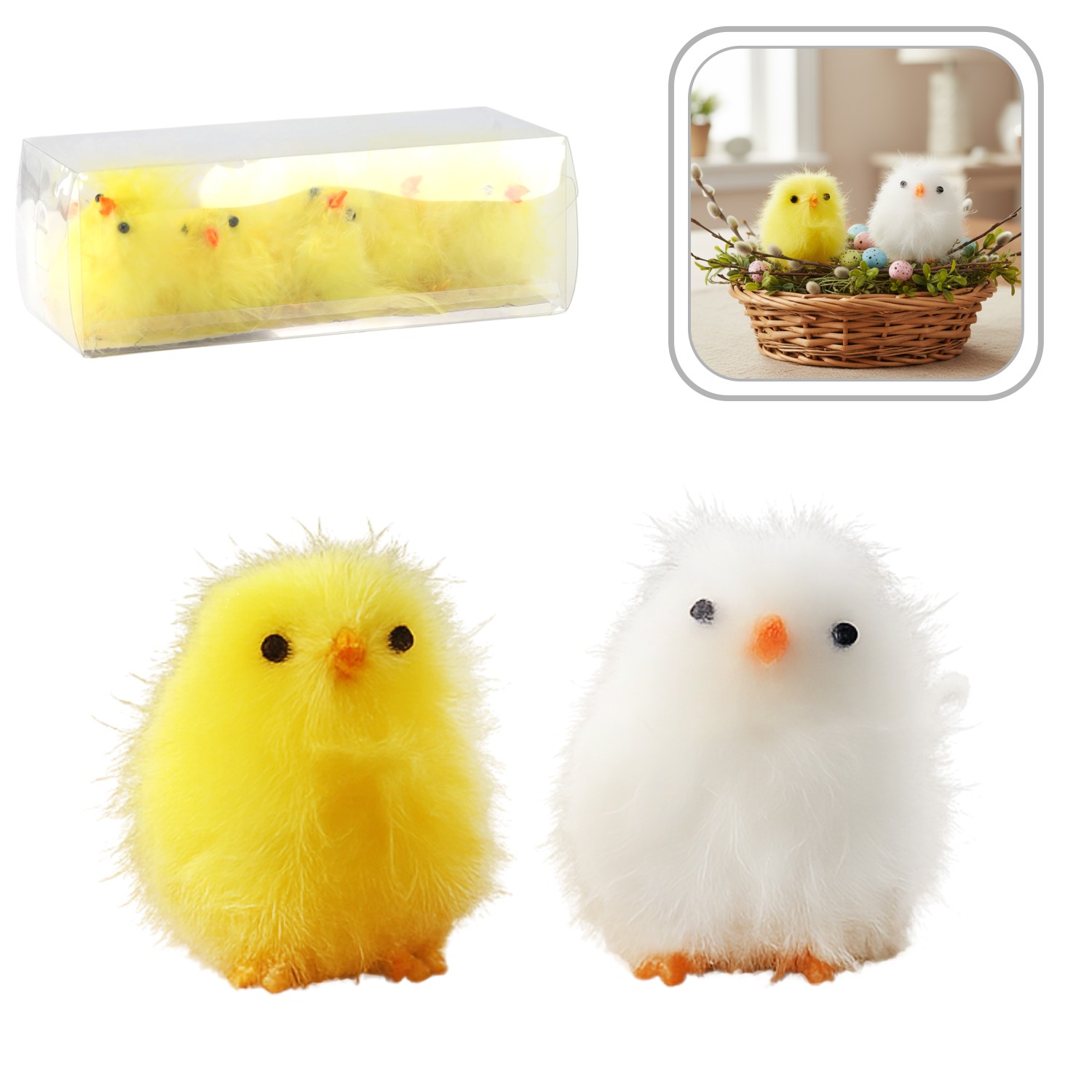 Оживіть святкову атмосферу завдяки набору з 10 чарівних пухнастих курчат жовтого та білого кольорів. Кожна курка має розміри 18 x 8 x 6,5 см, що робить її ідеальним доповненням до великодніх декорацій, прикрас столу або подарунків. Їх м'яка, пухнаста текстура та яскраві кольори додадуть тепла та радості в будь-якому інтер'єрі. Ідеально підходять як для оформлення будинку, так і в якості невеликого подарунка. Набір з 10 курчат - чудовий вибір для весняних декорацій та ігор з дітьми.