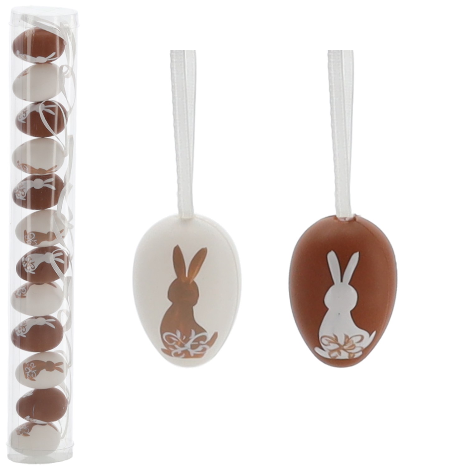 Додайте святкового шарму своїм декораціям завдяки набору з 12 великодніх яєць в елегантних відтінках білого та коричневого. Кожне яйце ретельно прикрашене витонченим візерунком та чарівним мотивом зайчика, що робить їх ідеальним вибором для віночків, кошиків та великодніх композицій.