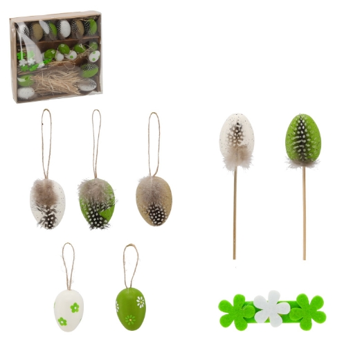 Набір містить:- 4 писанки на паличці - 2 зелені, 2 білі- 6 великих писанок (підвіска) - 2 зелені, 2 бежеві, 2 білі- 8 маленьких писанок (підвіска) - 4 зелені, 4 білі- 3 квіточки