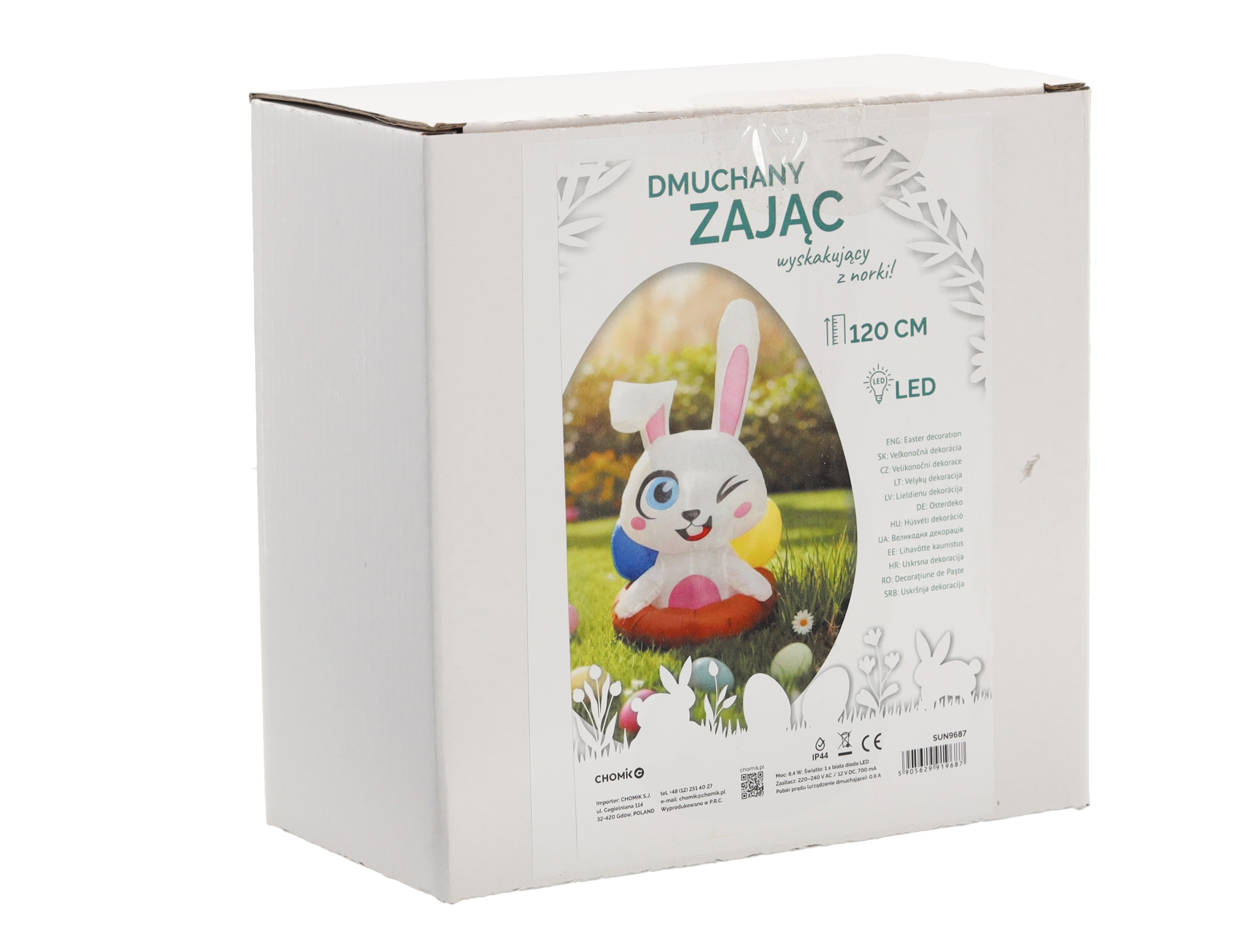 НАДУВНИЙ ЗАЙЦЬ Потужність: 8,4 ВтСтупінь захисту: IP44 (захист від бризок)Блок живлення: 220–240 В змінного струму / 12 В постійного струму, 700 мАСпоживання струму (пристрій для надування): 0,6 АДжерело світла: 1 біла світлодіодна лампа