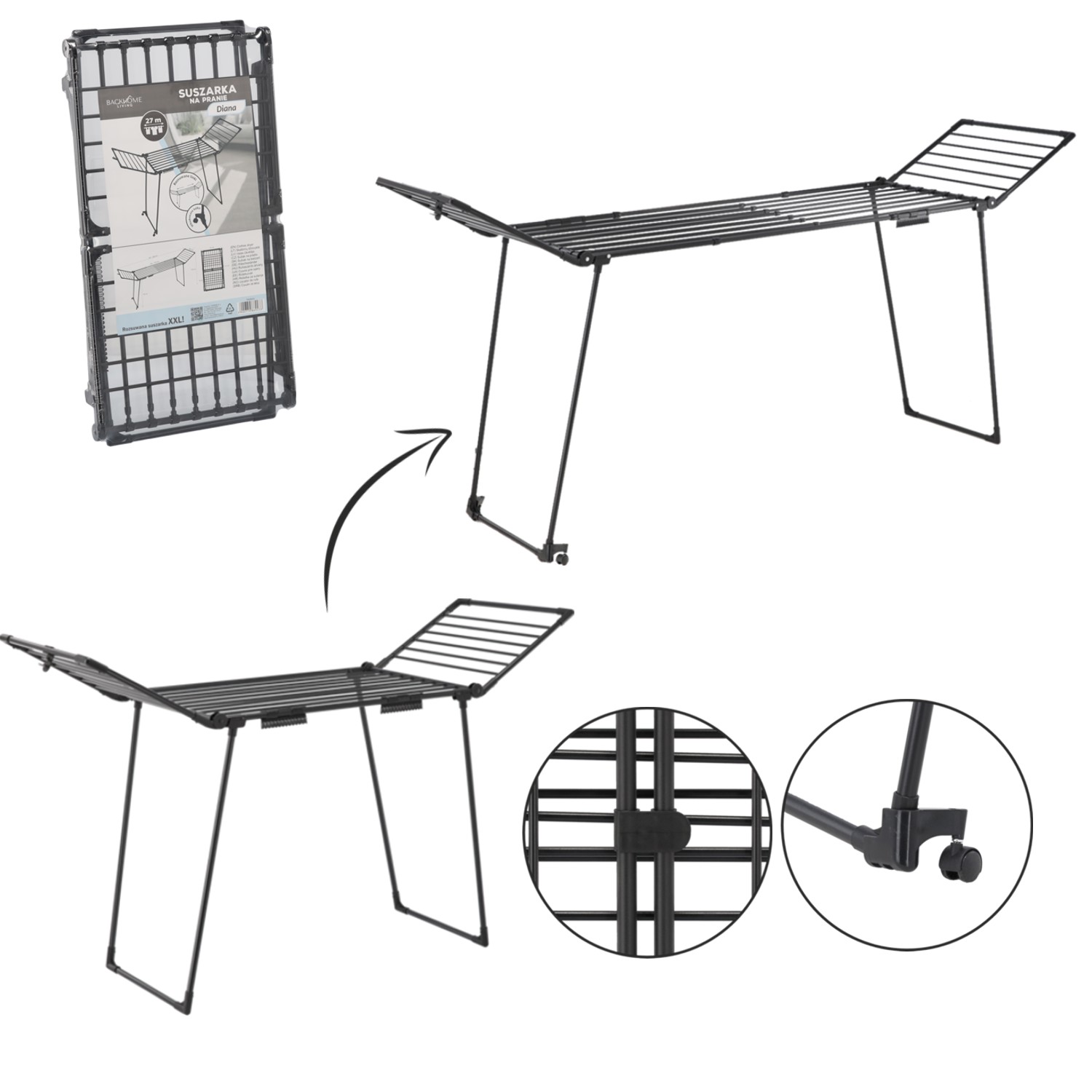 Практична сушарка для білизни «ДІАНА» з двома додатковими вішалками для шкарпеток, виготовлена з вуглецевої сталі, пофарбована порошковою фарбою в матовий чорний колір. Регульована довжина дозволяє пристосувати її до різних приміщень.