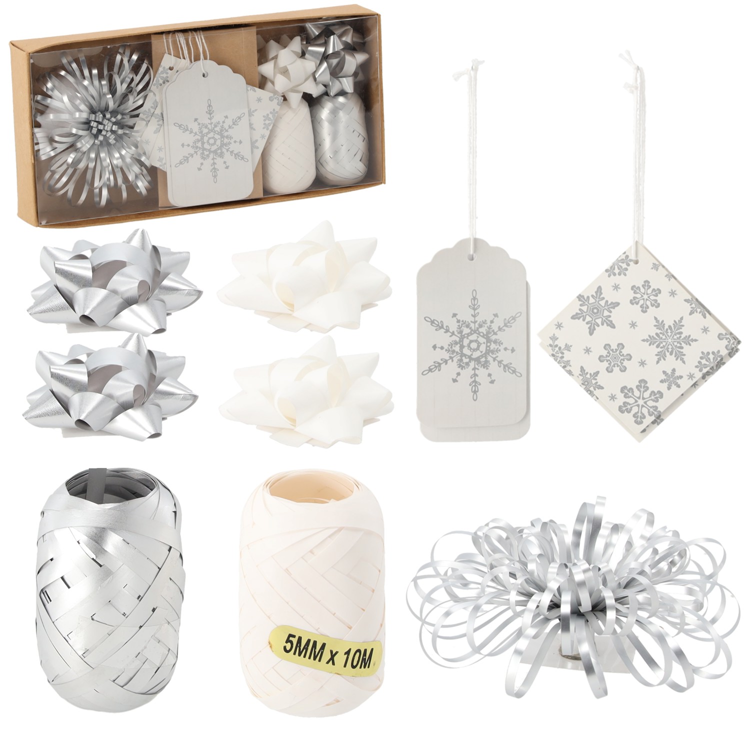 Бант 11 см - 1 шт.Бантики 5 см - 4 шт.Стрічка 5 мм*10 м - 2 шт.Підвіски для подарунків - 5 шт.