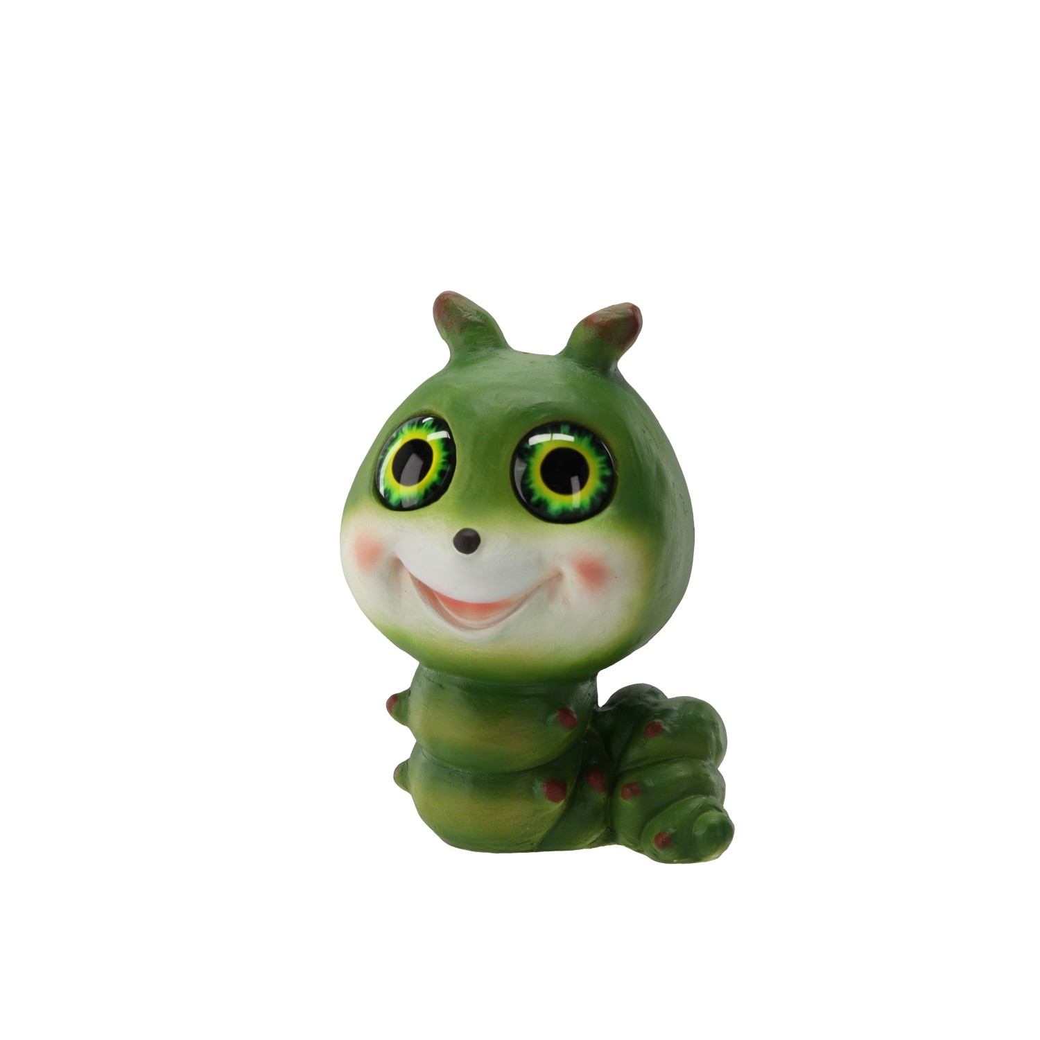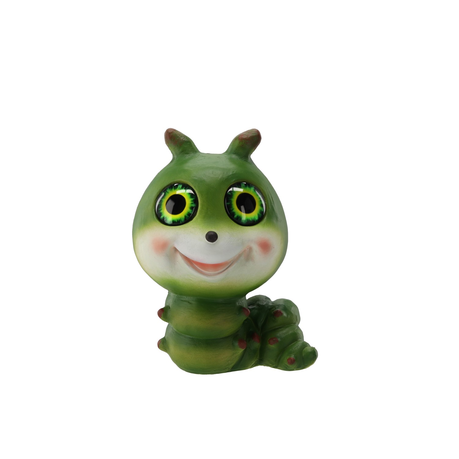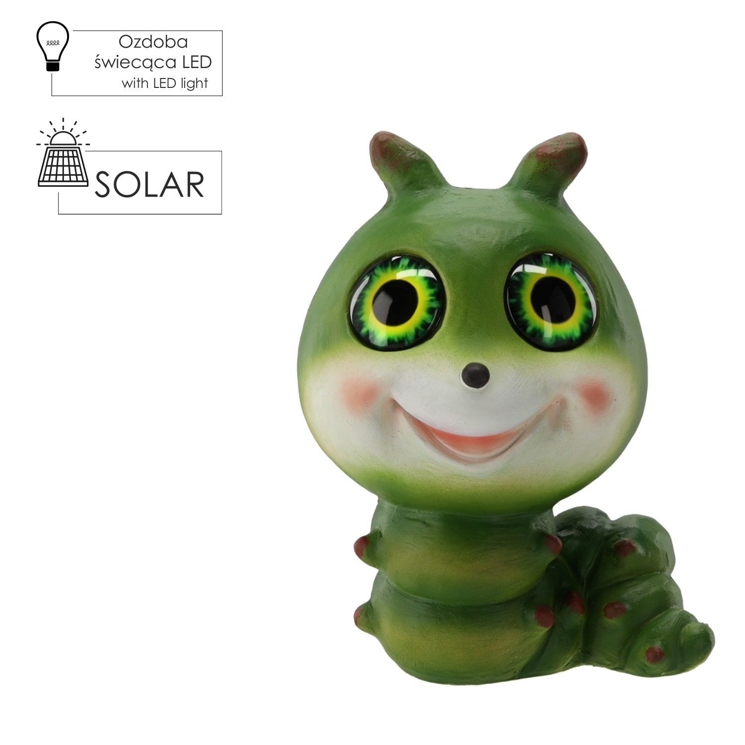 Садова фігурка «Гусениця» з сонячним LED-підсвічуваннямДекоративна фігурка гусениці з двома світлодіодами теплого білого кольору, розміщеними в очах. Живиться від сонячної енергії (акумулятор 1,2 В NiMH 300 мА·год). Виготовлена з міцного композиту магнію та скловолокна (MGO), стійкого до атмосферних умов.Розміри: 20,5 × 17 × 27 см