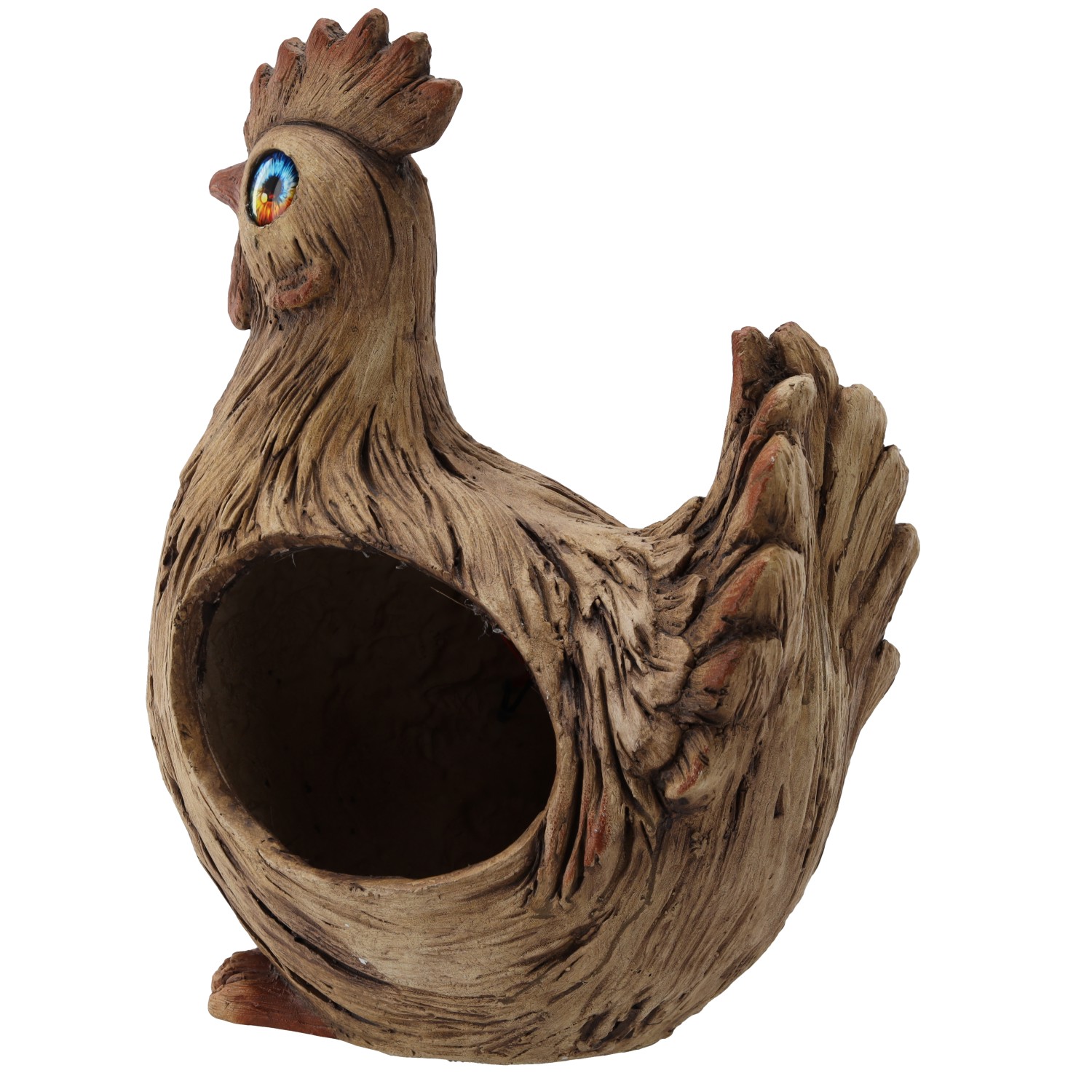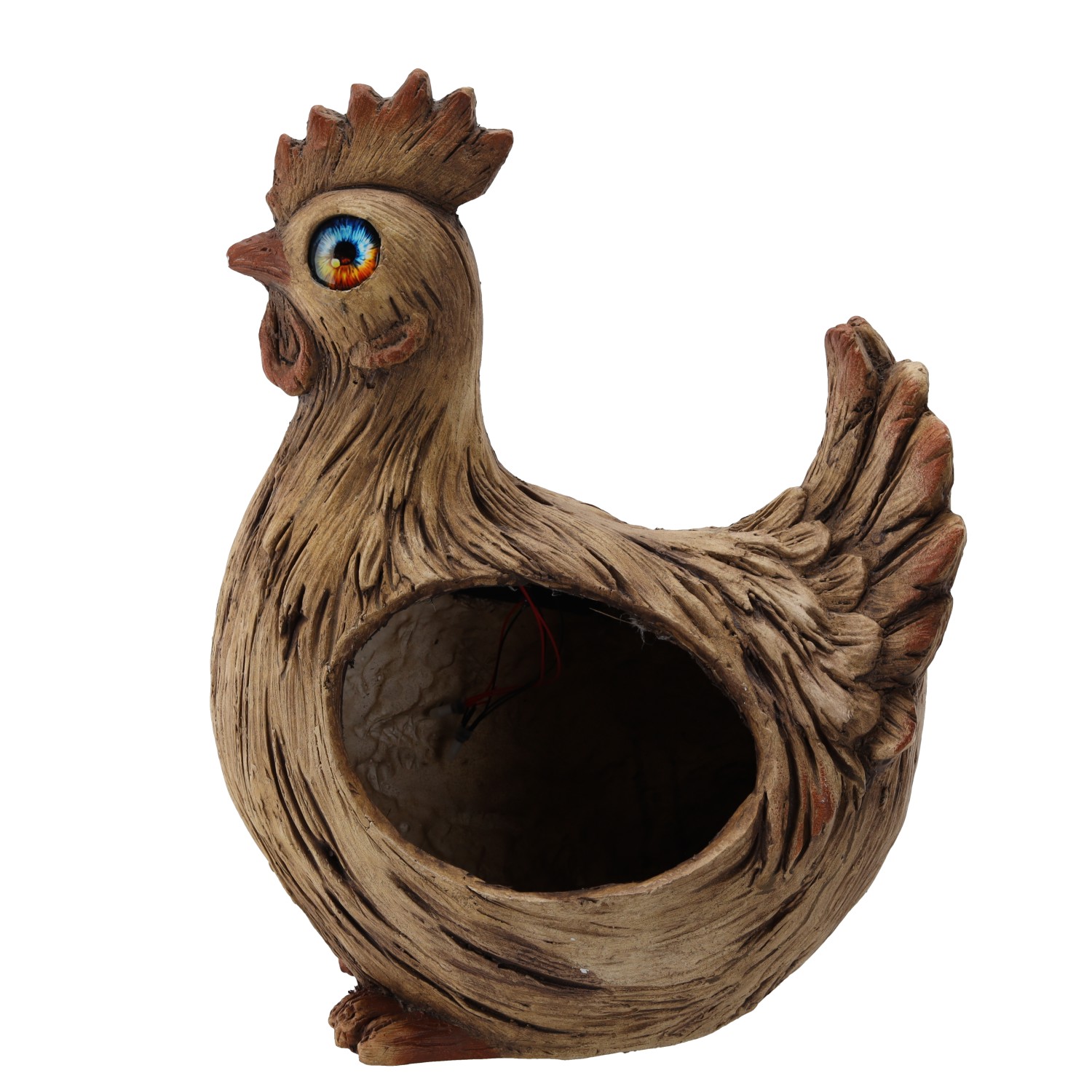 Садова фігурка «Півень» — вазон із сонячним LED-освітленнямДекоративна фігурка півня, що виконує функцію вазона, оснащена двома теплими білими світлодіодами в очах. Живиться від сонячної енергії (акумулятор 1,2 В NiMH 300 мАг). Виготовлена з міцного композиту магнію та скловолокна (MGO), стійкого до атмосферних умов.Розміри: 29,5 × 20 × 38 см