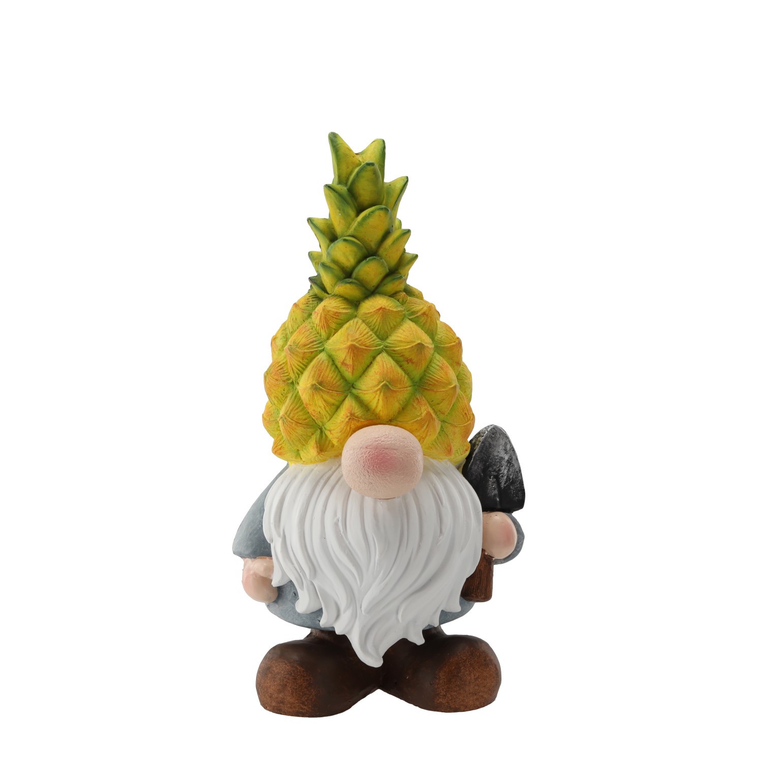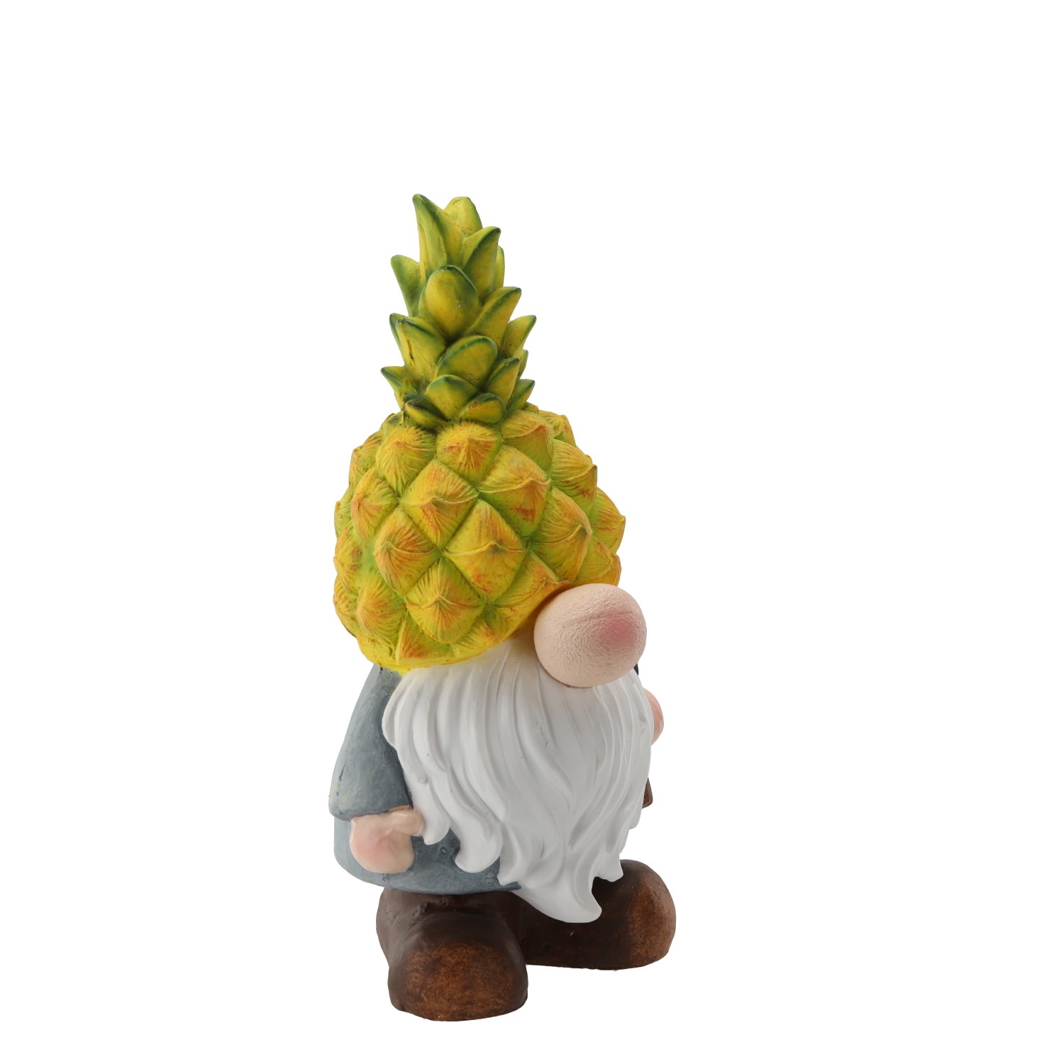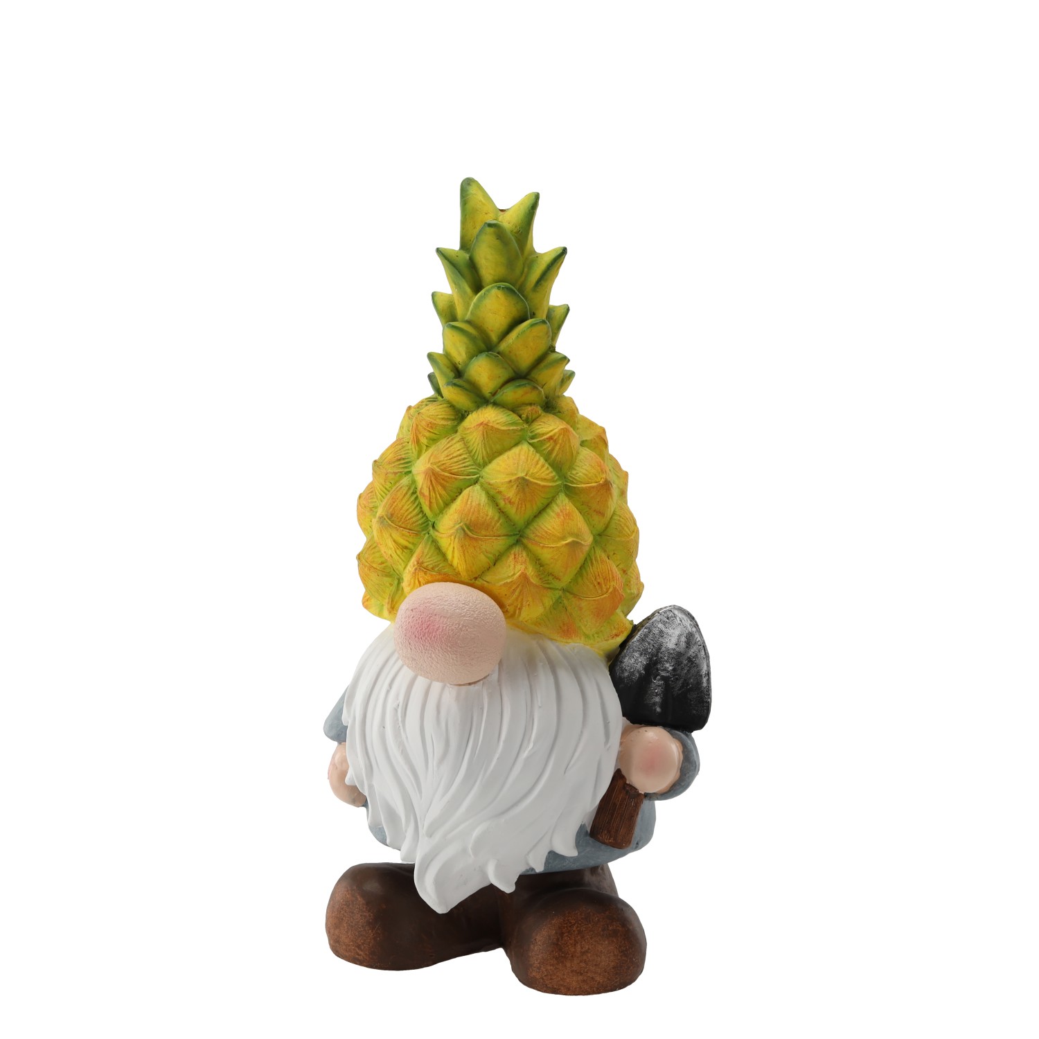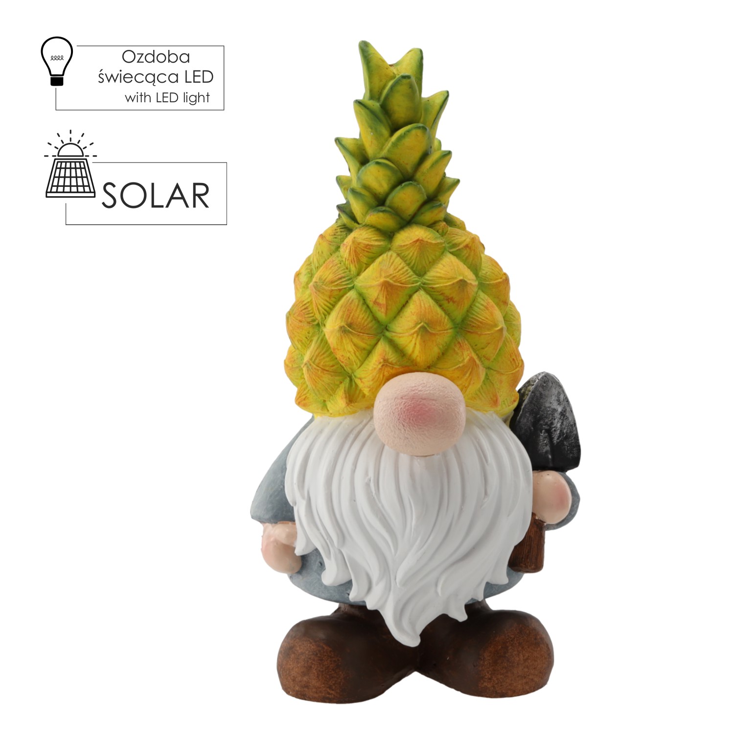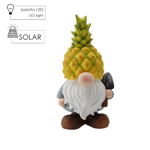 Садова фігурка «Карлик з ананасом» із сонячним LED-підсвічуваннямДекоративна фігурка карлика, що тримає ананас, оснащена світлодіодним освітленням, що живиться від сонячної енергії (акумулятор 1,2 В NiMH 300 мА·год). Виготовлена з міцного композиту магнію та скловолокна (MGO), стійкого до атмосферних умов.Розміри: 21 × 18 × 40 см