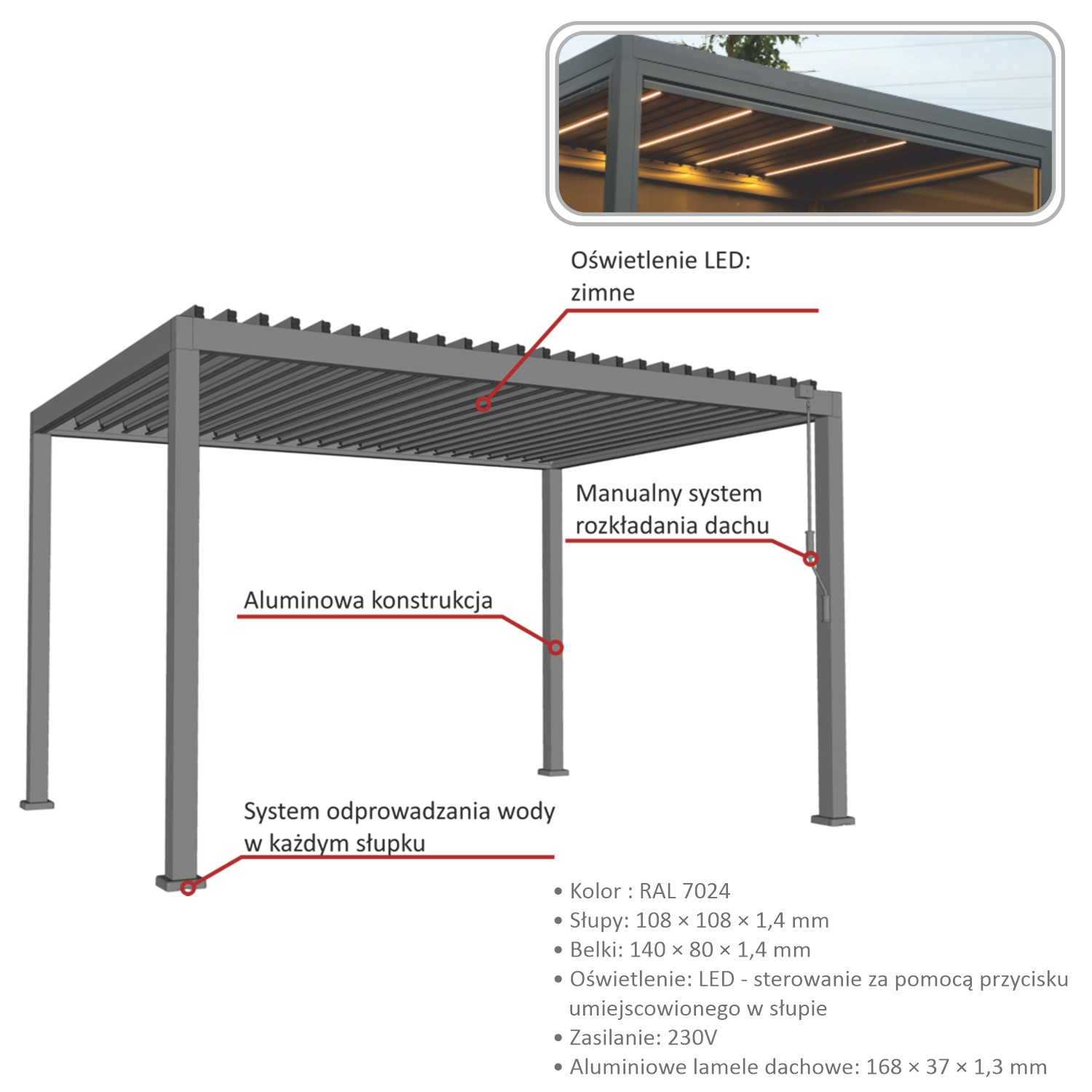 Алюмінієва садова пергола LED 3 × 4 × 2,5 м — це стильне і практичне накриття, яке перетворює сад або терасу на комфортну зону відпочинку. Після покупки ви отримуєте міцну конструкцію, сучасний вигляд і зручність використання протягом усього року 🌿✨