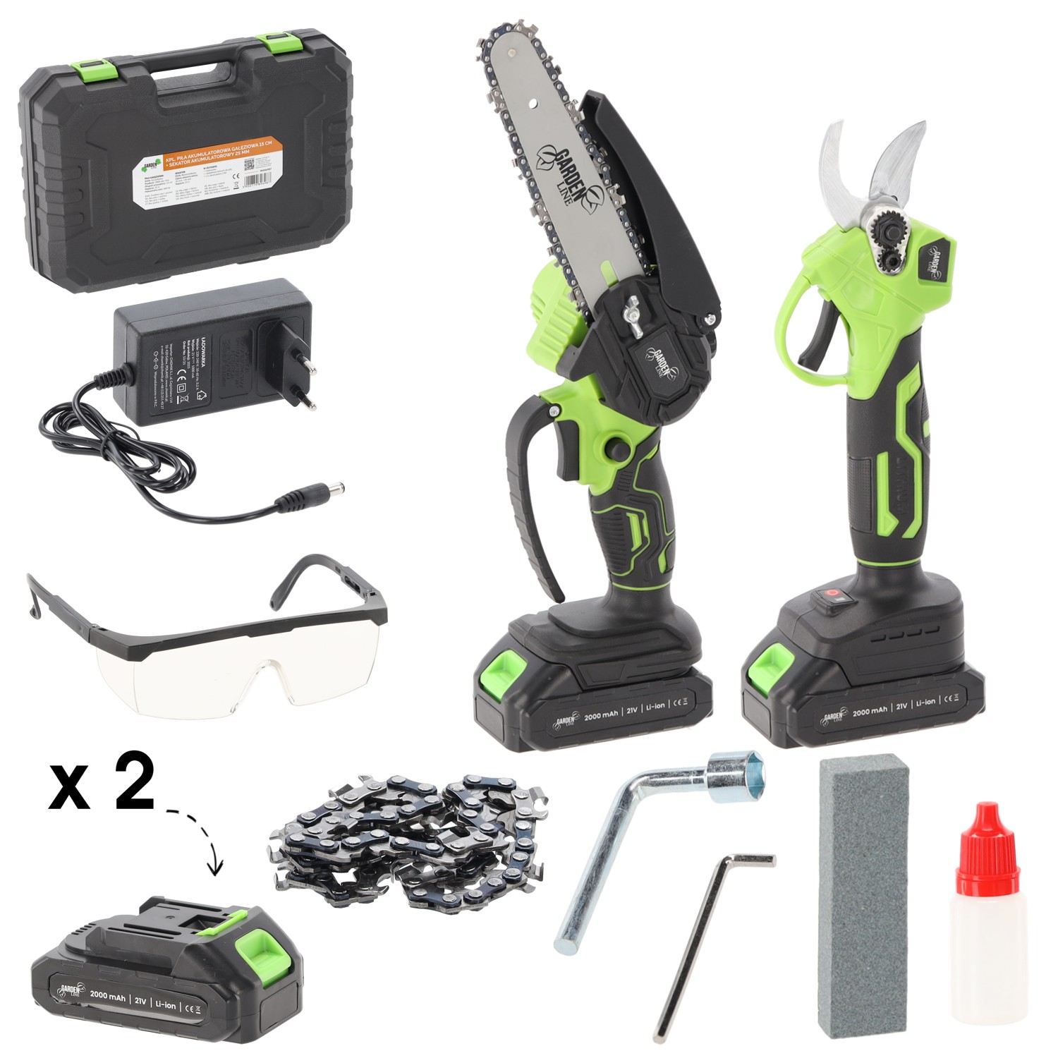 Подбайте про свій сад за допомогою професійного набору акумуляторних інструментів! 🔧 До складу набору входить зручна ланцюгова пила для різання деревини та гілок, а також потужний акумуляторний секатор для точного різання гілок. Це ідеальна пара для комплексного догляду за рослинами – швидко, зручно та без зусиль! ✂️