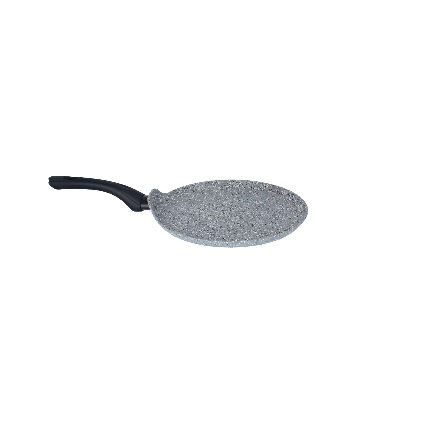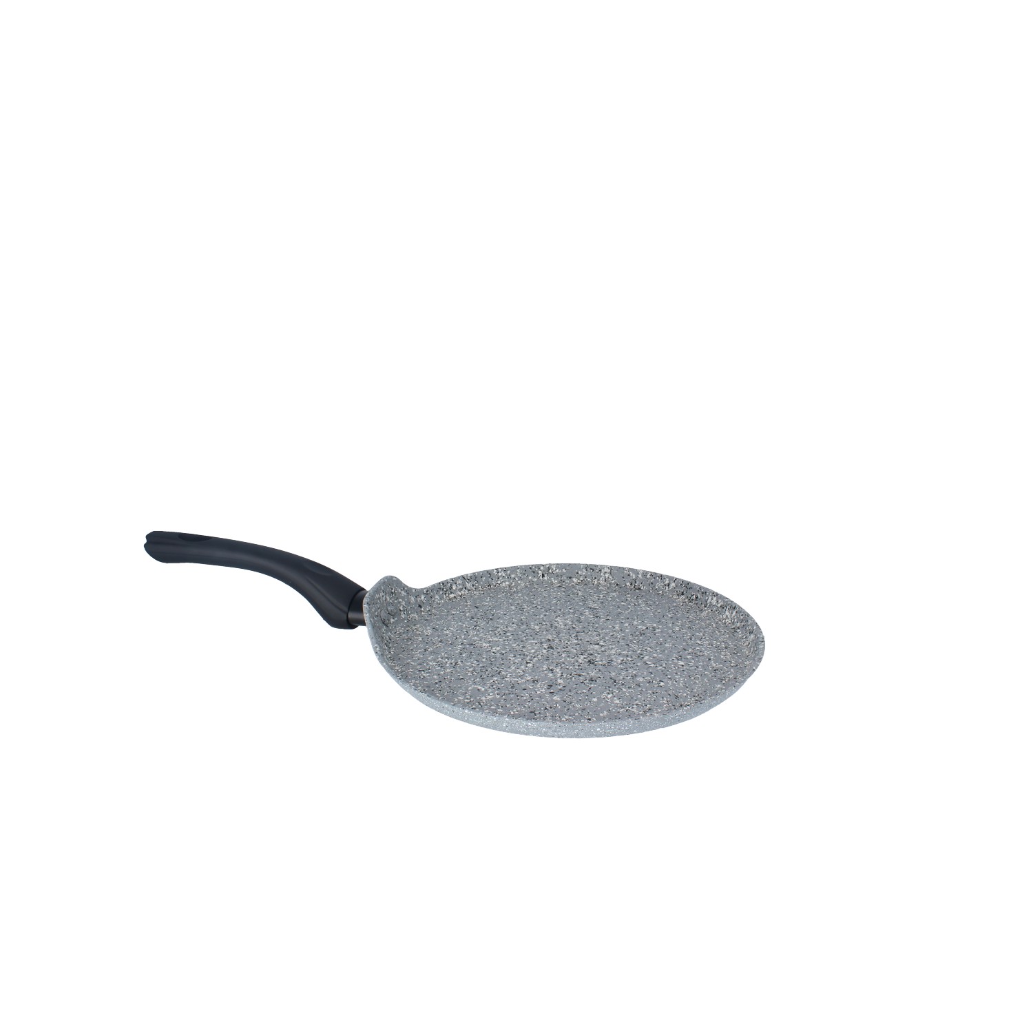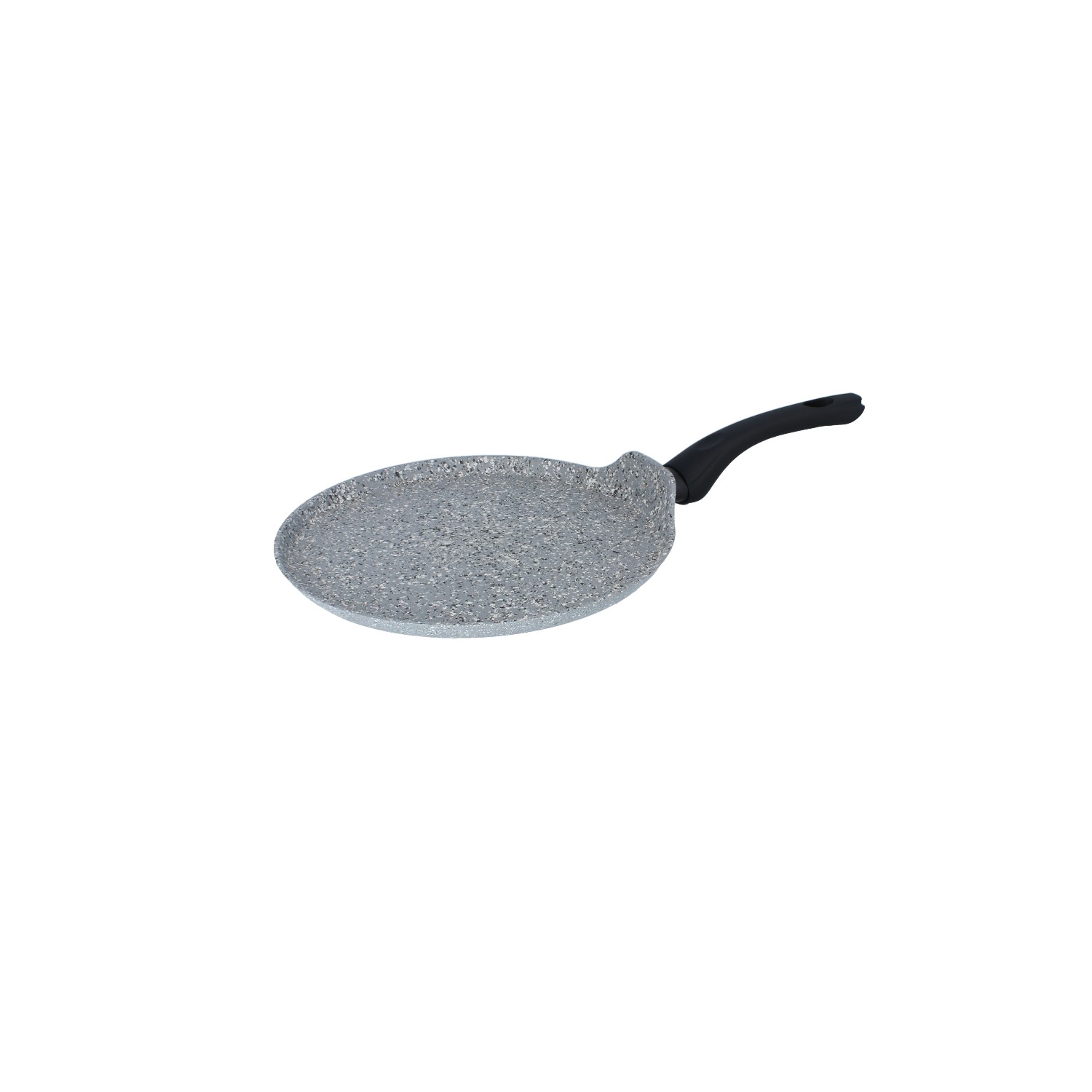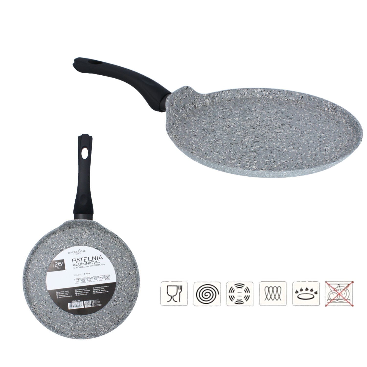 Сковорода 26 см — коване алюміній, гранітне покриттяУніверсальна сковорода діаметром 26 см, виготовлена з міцного кованого алюмінію, що забезпечує швидке та рівномірне розподілення тепла. Товщина корпусу – 4,0 мм по краях та 3,0 мм на дні – гарантує довговічність та термостабільність під час використання.Як внутрішня, так і зовнішня поверхня сковорідки покриті високотемпературним гранітним покриттям, що характеризується високою стійкістю до подряпин та легкістю в очищенні. Ергономічна ручка з міцного нейлону забезпечує зручність та безпеку використання.Завдяки своїй конструкції та плоскому профілю ідеально підходить для смаження тонких страв, таких як млинці, омлети або коржі.Характеристики:* Тип: Сковорода* Діаметр: 26 см* Матеріал: коване алюміній* Товщина: стінка 4,0 мм / дно 3,0 мм* Внутрішнє покриття: гранітне, стійке до високих температур* Зовнішнє покриття: гранітне, стійке до високих температур* Ручка: ергономічна, з нейлонуПереваги:* Рівномірне нагрівання без перегріву* Антипригарне покриття – дозволяє смажити з мінімальною кількістю жиру* Легка, але водночас міцна конструкція* Легке очищення* Особливо добре підходить для смаження тонких страв, наприклад, млинців або омлетів