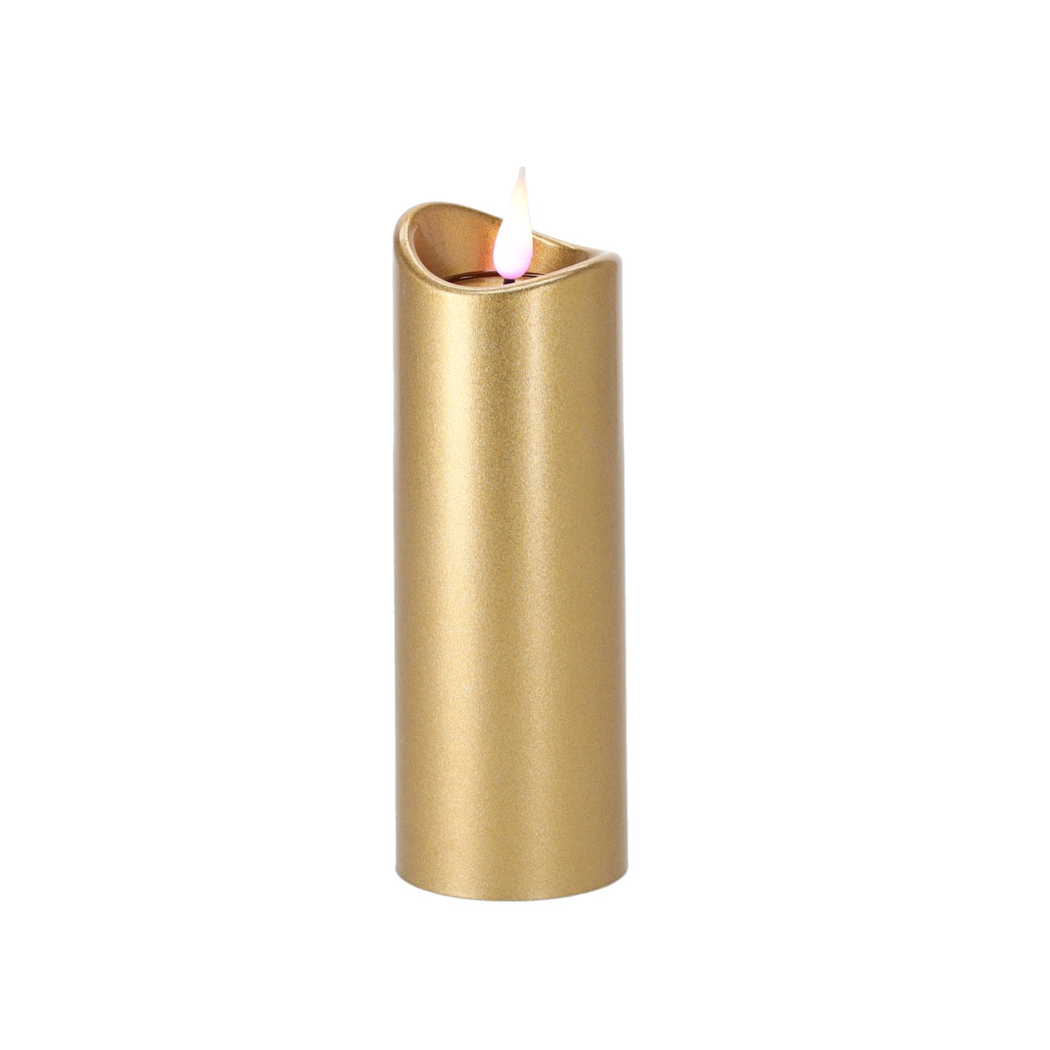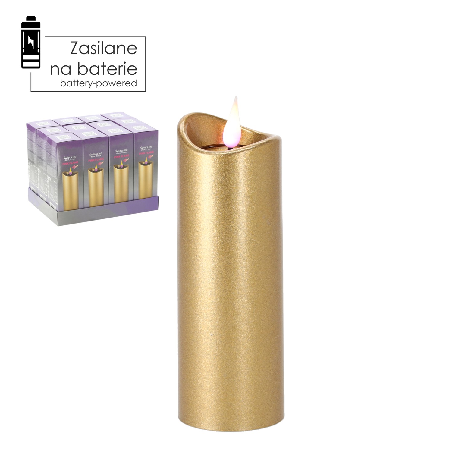Свічка LED розміром 5 x 15 см золотого кольору, що випромінює рожеве полум'я. Живиться від батарейок, які забезпечують тривале та безпечне освітлення. Ідеально підходить для прикрашання надгробків та інтер'єрів.