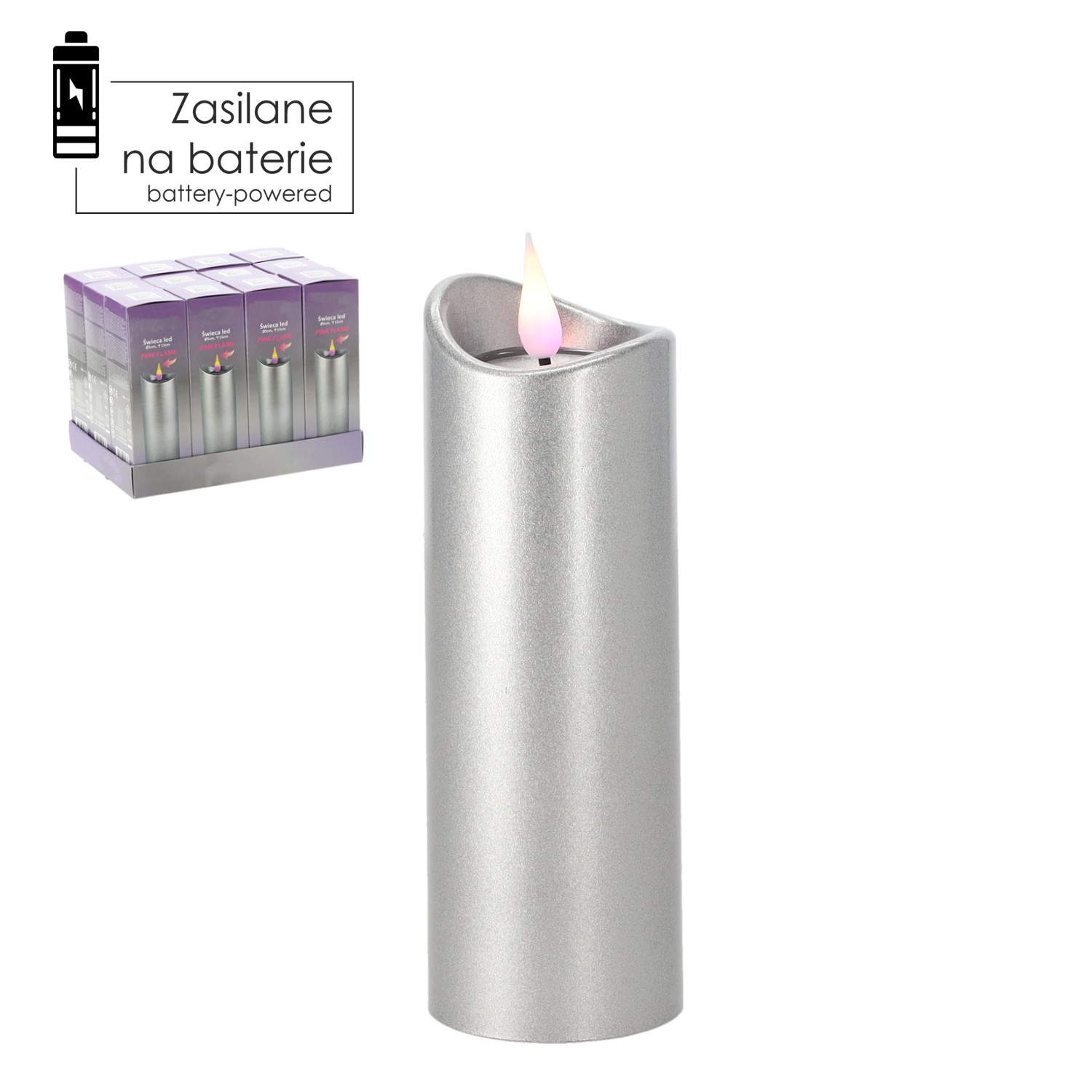 Свічка LED розміром 5 x 15 см сріблястого кольору, що випромінює рожеве полум'я. Працює від батарейок, які забезпечують тривале та безпечне освітлення. Ідеально підходить для прикрашання надгробків та інтер'єрів.