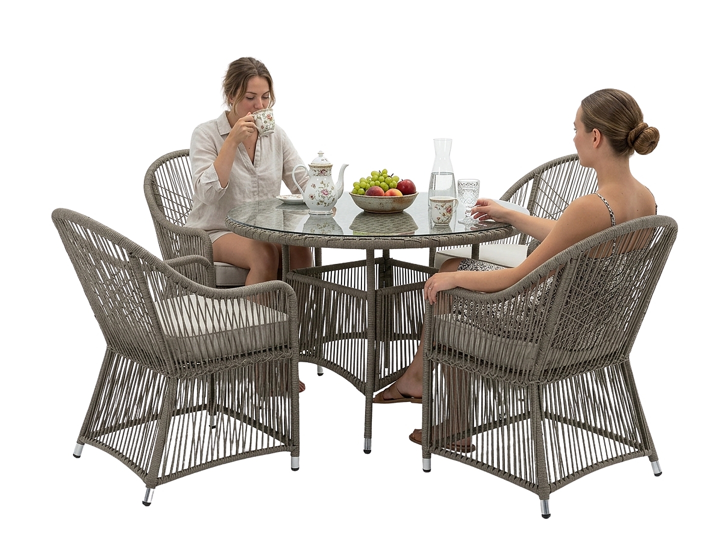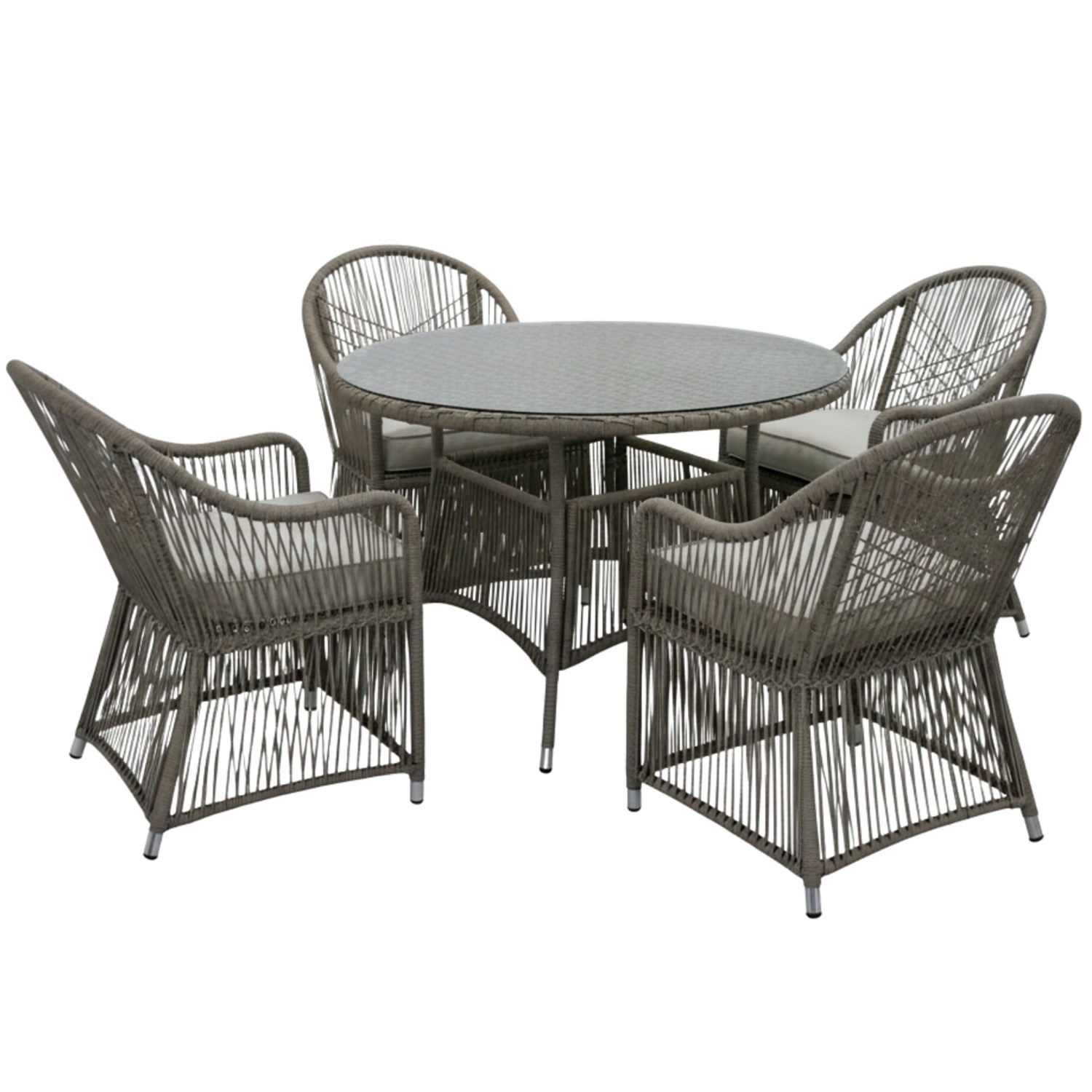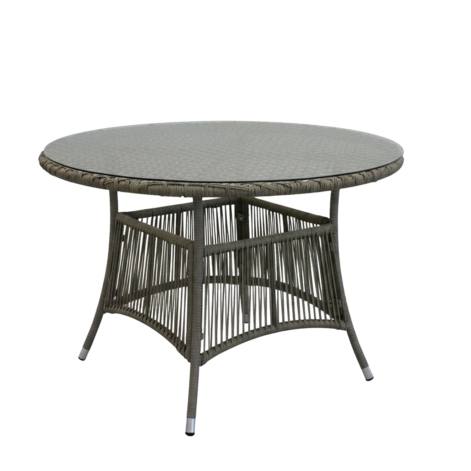 Матеріали:• Конструкція: алюміній• Ротанг: плоский, 5,5 × 3,2 мм, відкрите плетіння• Стільниця столика: загартоване скло 5 мм• Подушки: спін-поліестер, товщина 8 см