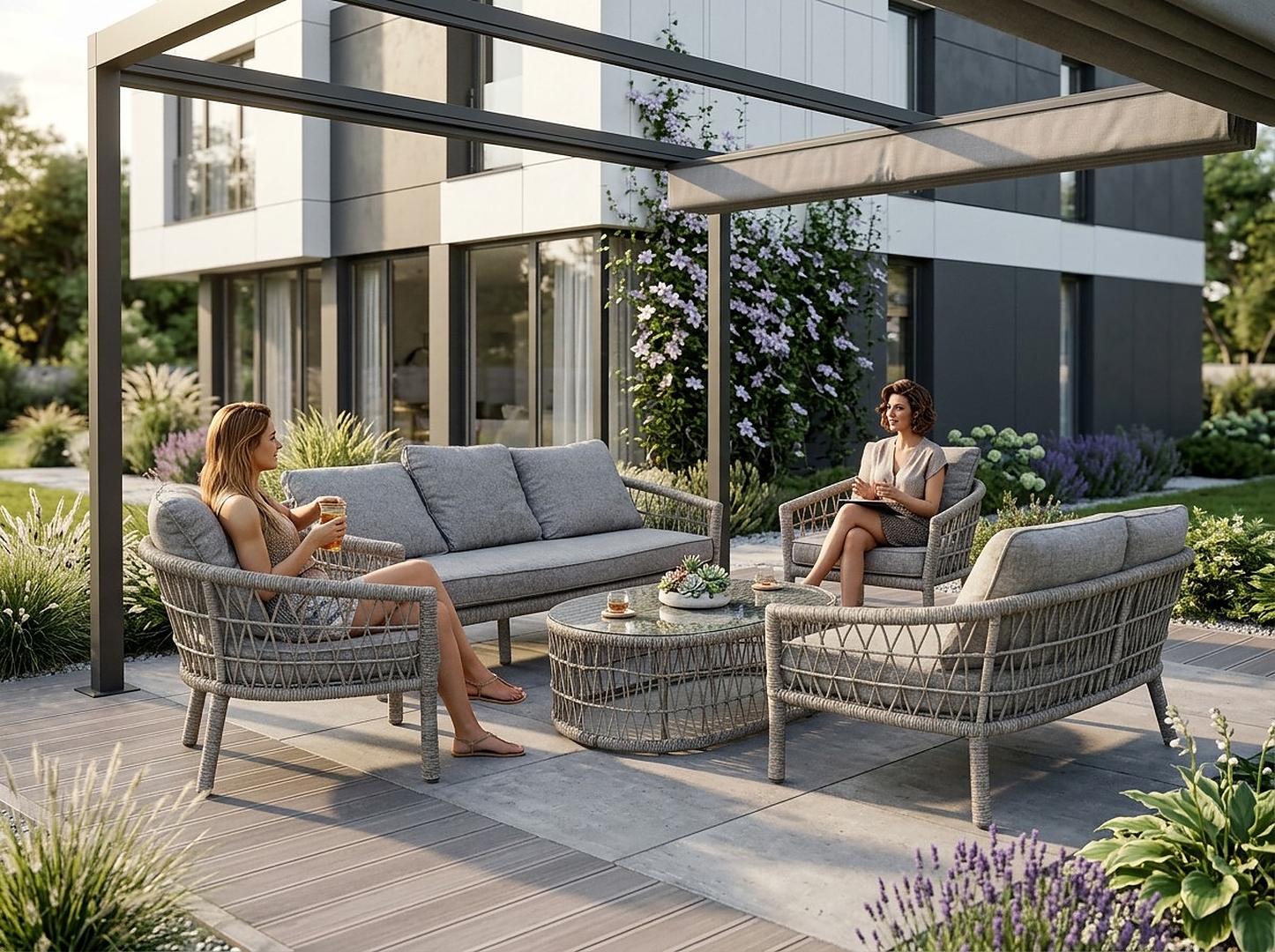 Створіть цілісну та комфортну зону відпочинку в саду, на терасі або патіо. Цей елегантний комплект садових меблів поєднує легкий, але міцний алюмінієвий каркас, сучасний ротанг з відкритим плетінням та товсті, зручні подушки, забезпечуючи ідеальні умови для щоденного відпочинку та зустрічей з близькими ☀️☕