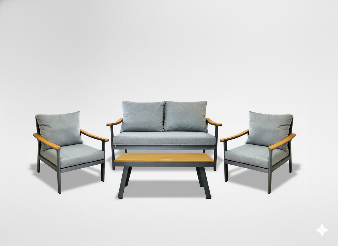 Елегантний і сучасний комплект алюмінієвих меблів, який ідеально підійде для саду, тераси або зони відпочинку. Поєднання алюмінієвої рами з елементами, що імітують дерево, та сіткою Textilene забезпечує довговічність, комфорт використання та стійкість до атмосферних умов.