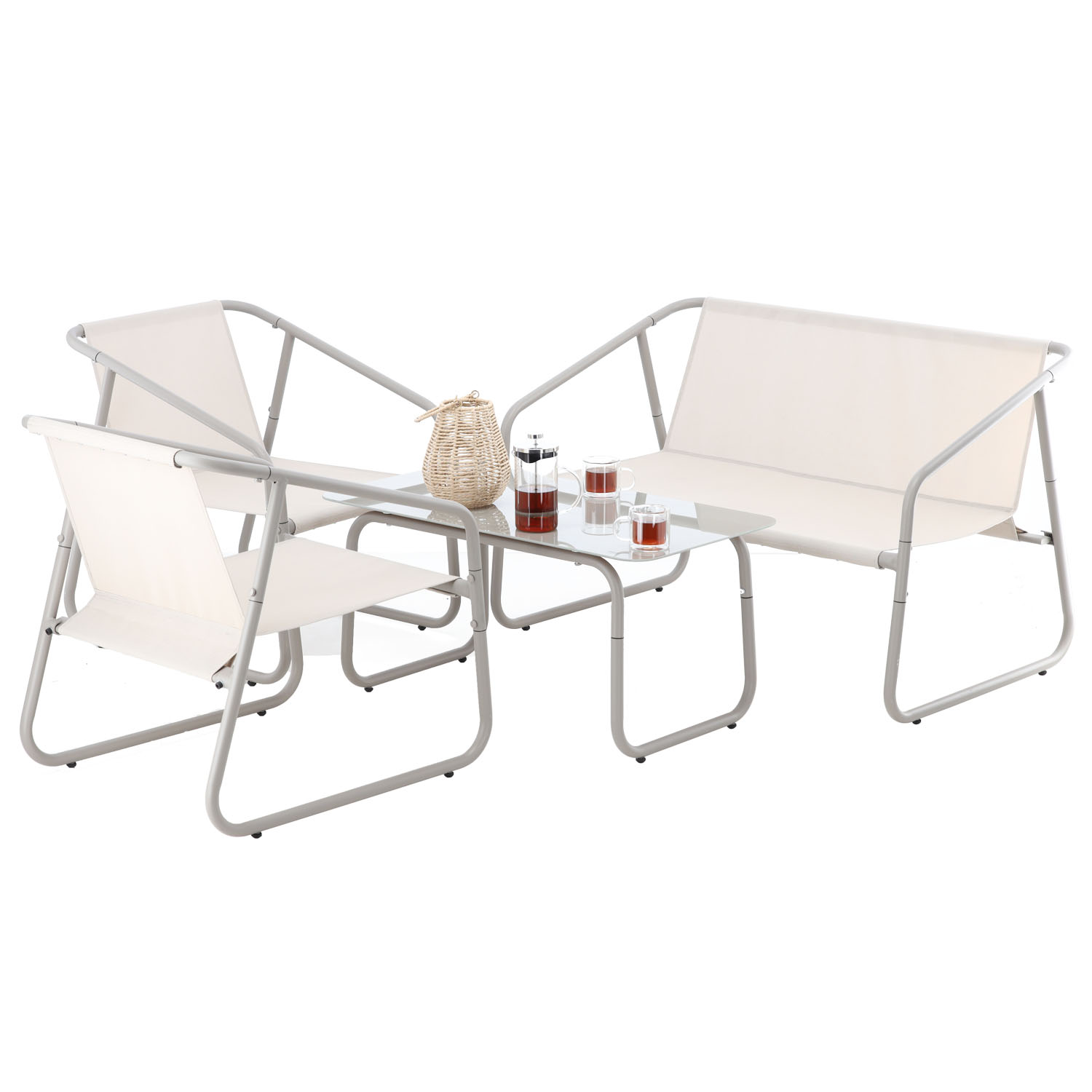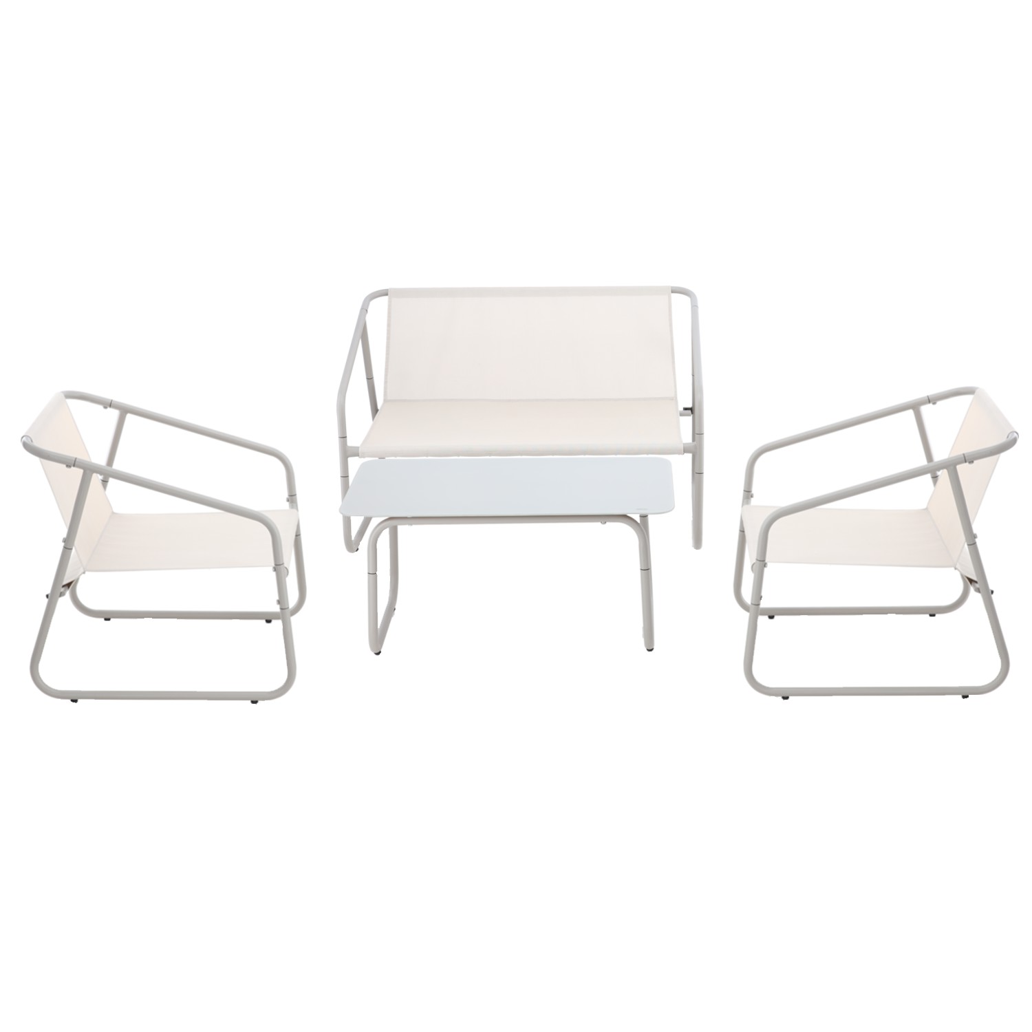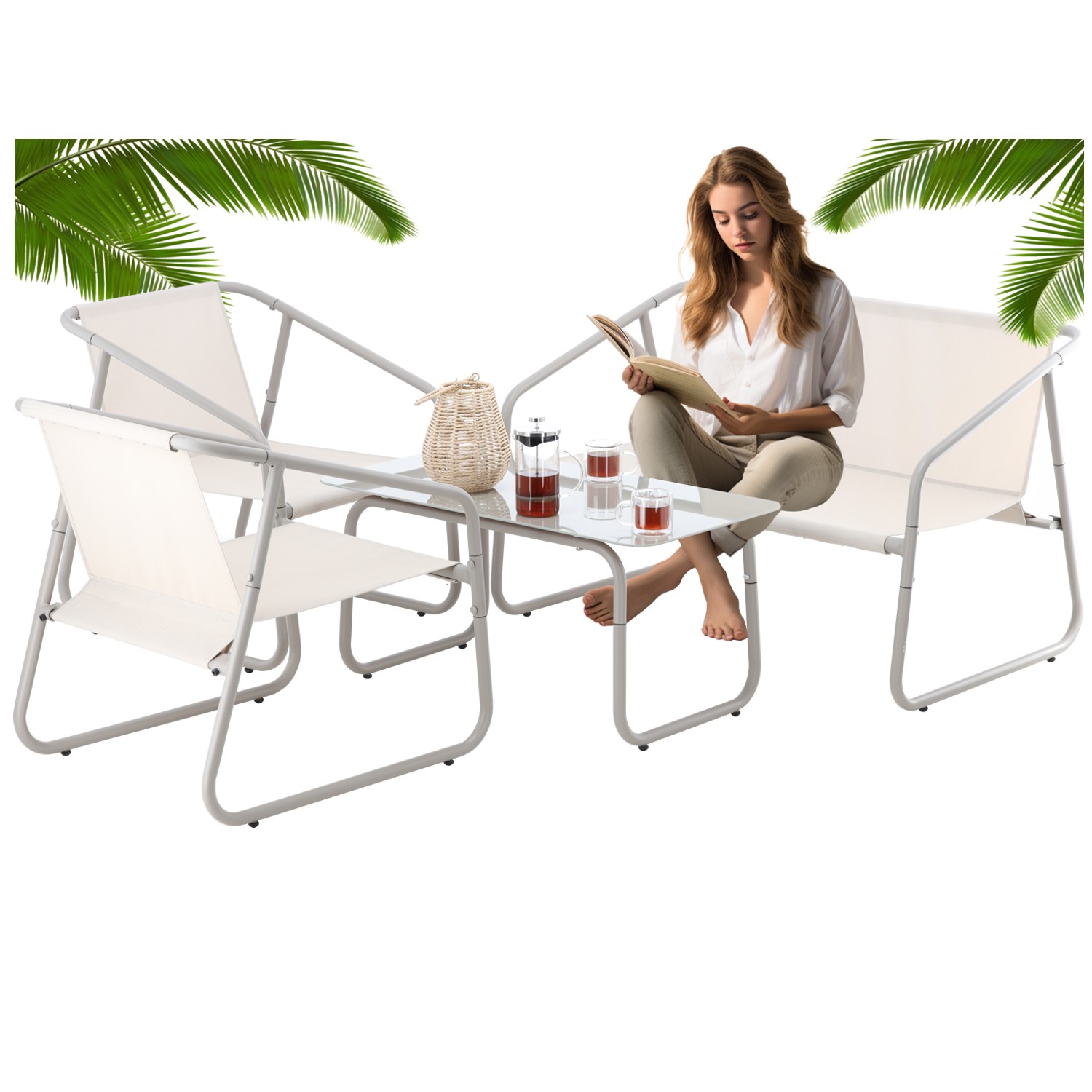 Комплект садових меблів включає двомісний диван, два стільці та столик. Він ідеально підійде для саду, тераси або балкона, поєднуючи функціональність та естетику в одному. Міцна сталева конструкція в поєднанні з елегантним загартованим склом забезпечує довговічність та комфорт використання.