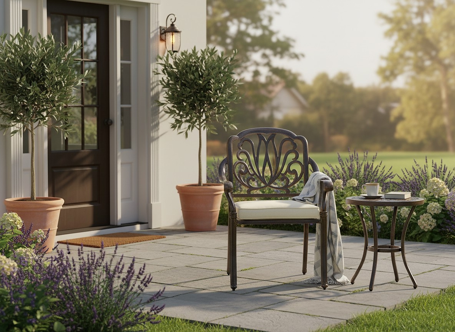 Однорідна кольорова гама та універсальна форма меблів дозволяють створити гармонійну композицію, яка чудово вписується як у сучасні, так і в класичні зовнішні простори.