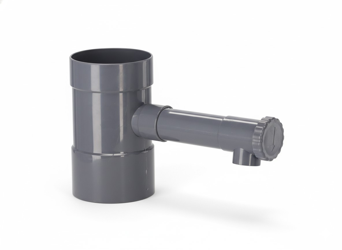 Хочете ефективно використовувати воду з даху та зменшити споживання води з крана? Цей сірий збирач дощової води діаметром 100 мм — це практичне та екологічне рішення для монтажу на водостічній трубі. 💧🌿
