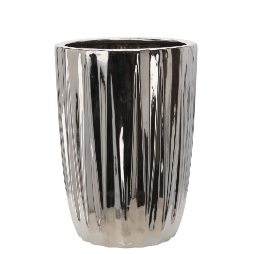 Сучасний керамічний чохол із сріблястим блиском та рифленою поверхнею - ідеальний вибір для любителів елегантних інтер'єрів. Його тонкі рифлення надають унікальної текстури, а блискуче покриття додає розкішного акценту. Ідеально підходить для експонування зелених рослин та квітів у горщиках.