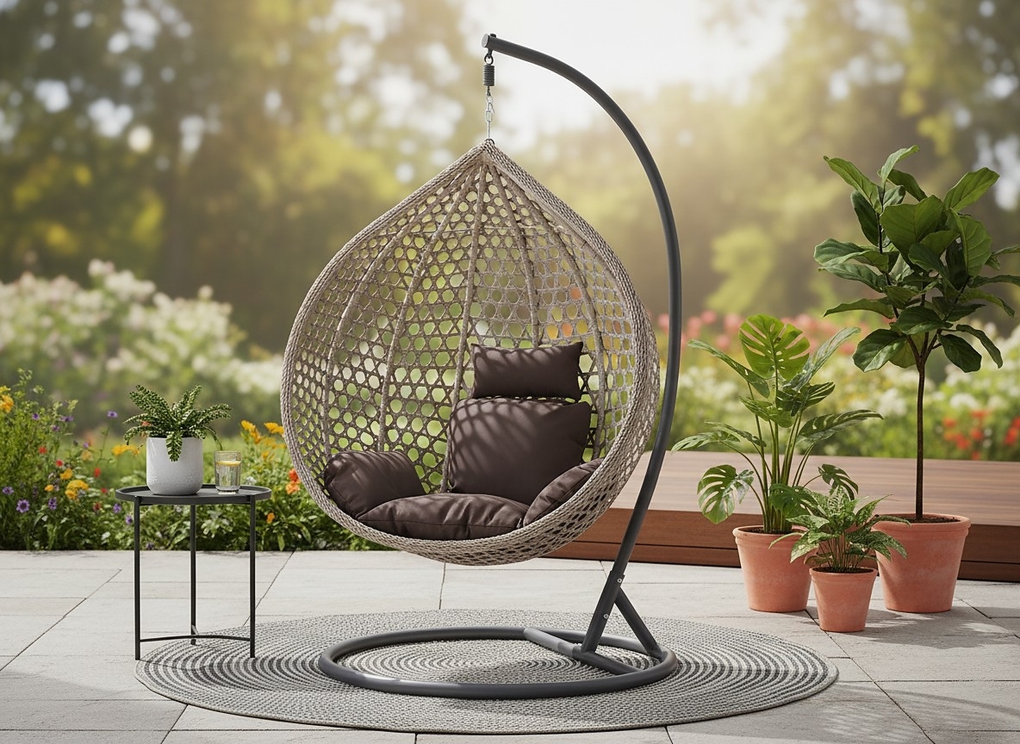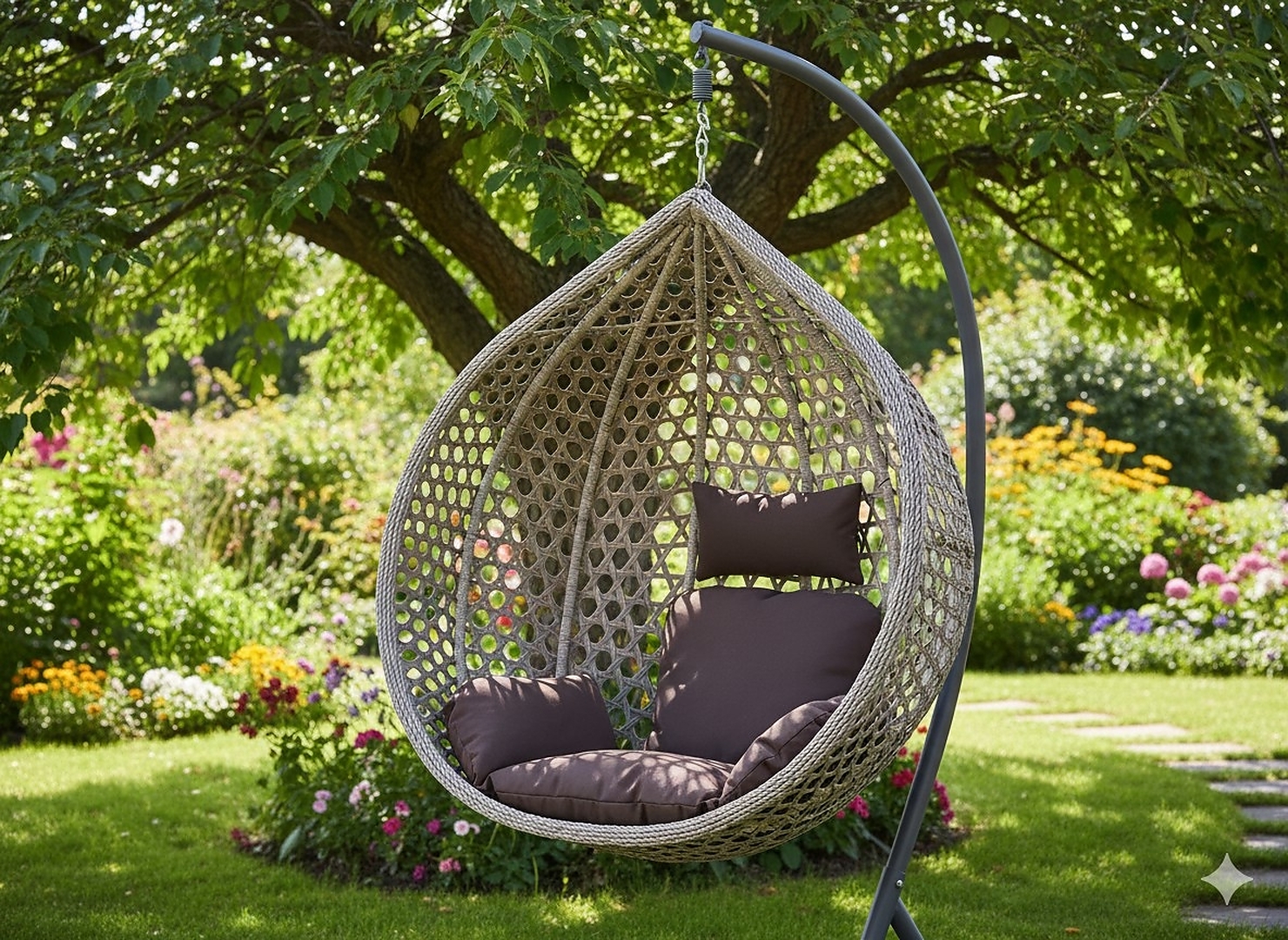 Шукаєте більший комфорт і нотку екзотики у своєму саду? Підвісне крісло XL з коричневою подушкою — ідеальне рішення: більше місця, більше зручності, більше релаксу!
