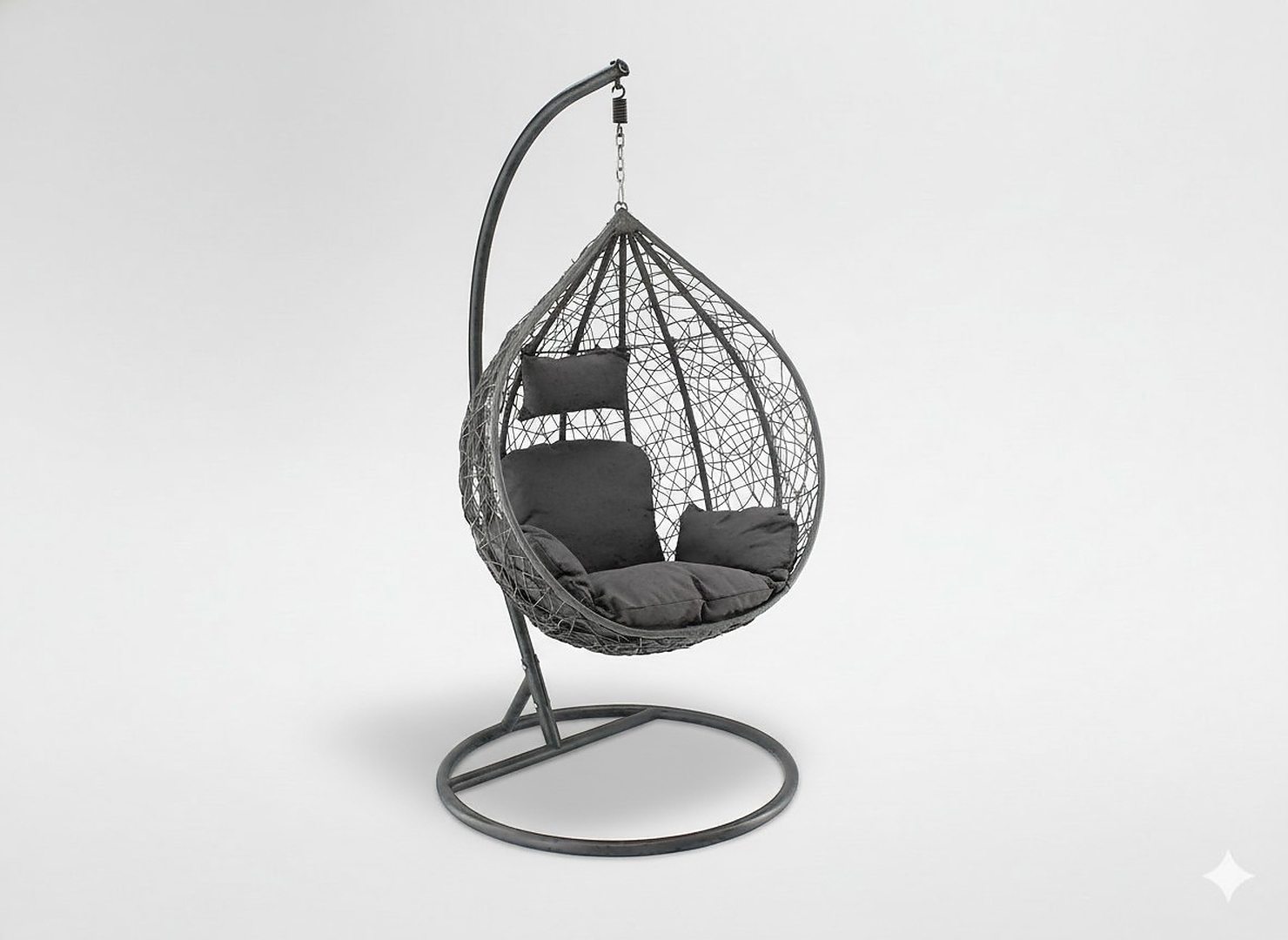 Елегантний і сучасний – цей підвісний крісло в глибокому відтінку темно-сірого кольору – справжня знахідка для любителів стриманого дизайну. Компактний, але надзвичайно зручний – ідеально підходить для балкона, тераси або інтер'єру.