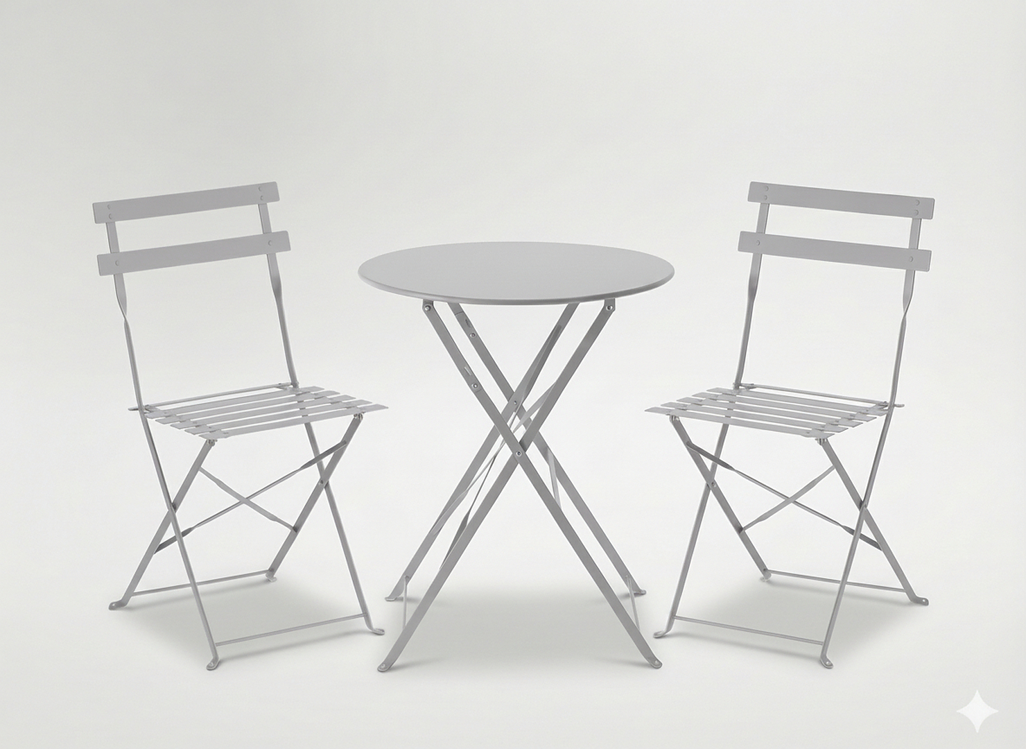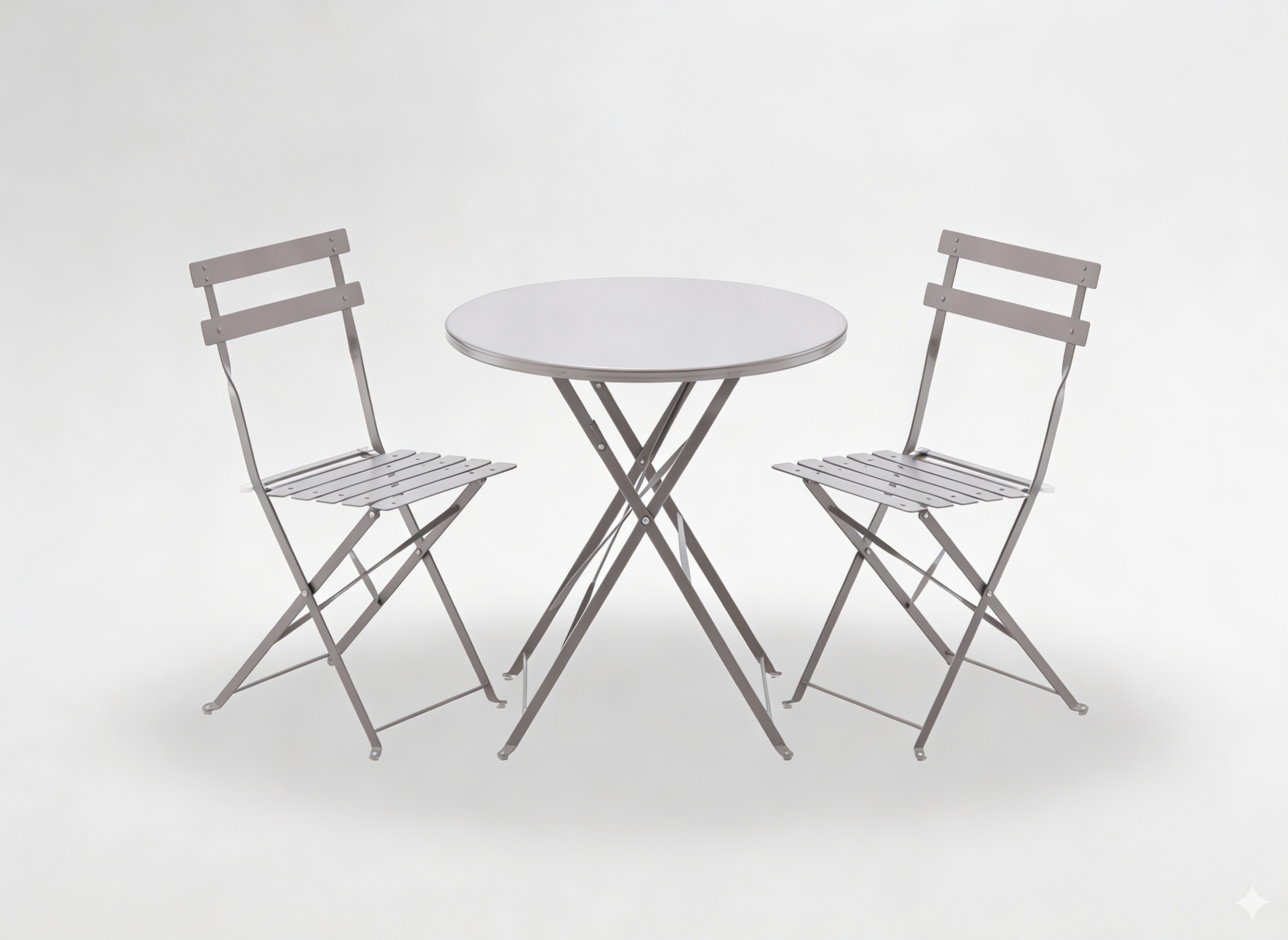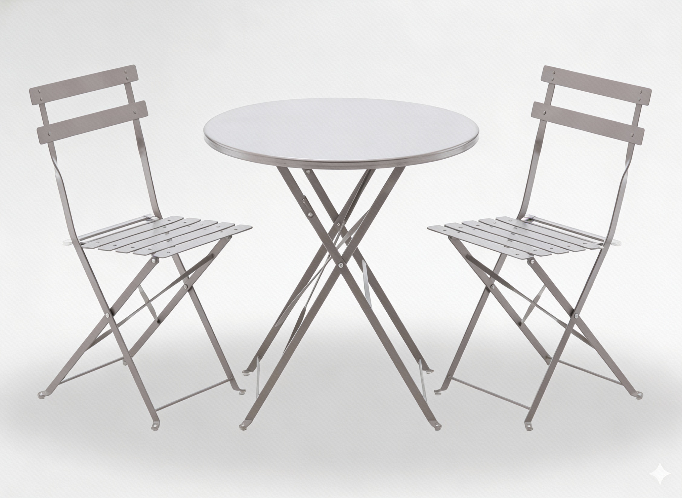 Елегантний і компактний набір садових меблів сірого кольору. Круглий стіл і два стільці виготовлені з високоякісної оцинкованої та порошкової фарбованої сталі, що забезпечує міцність і стійкість до атмосферних умов. Ідеально підходить для саду, тераси та балкона.
