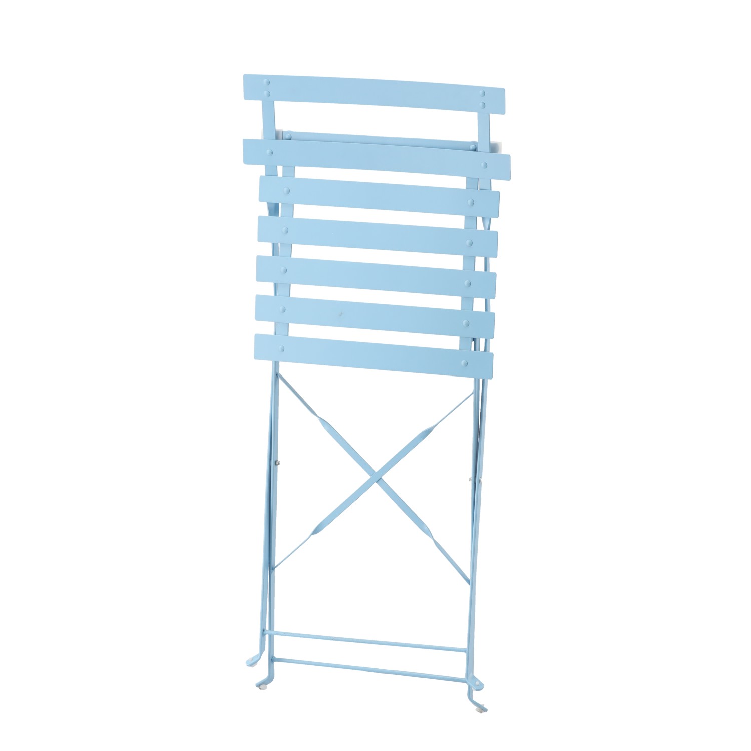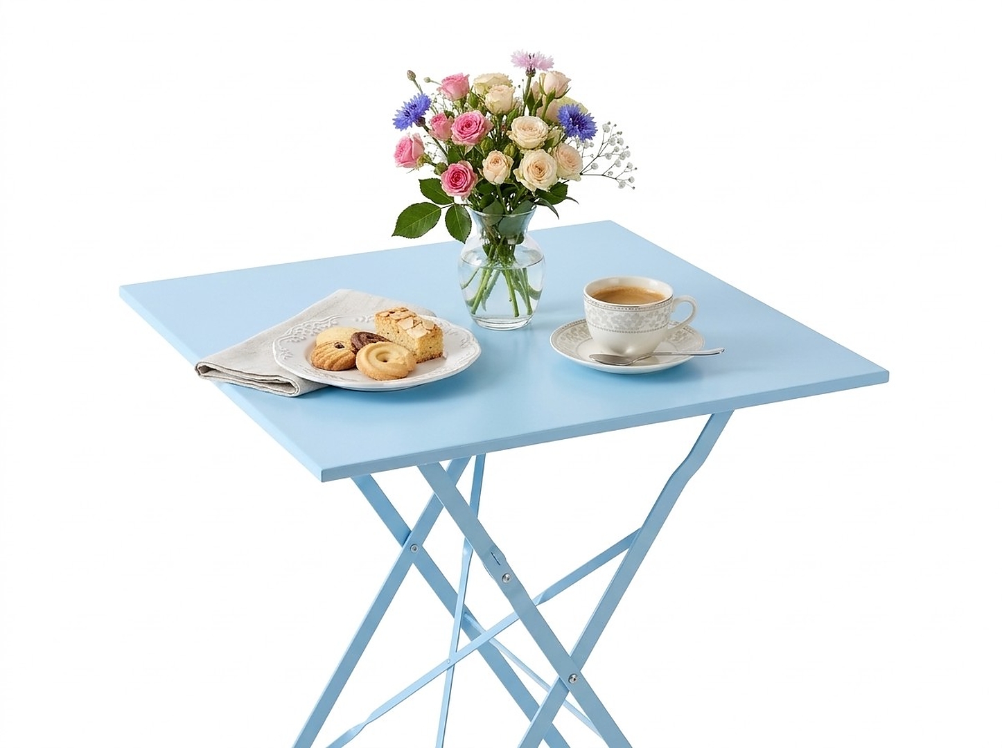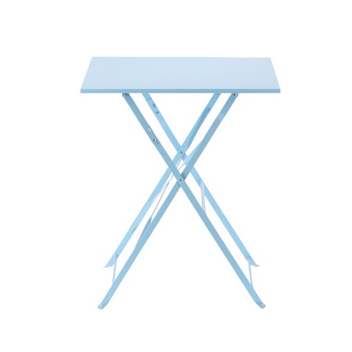 Елегантний та компактний комплект садових меблів синього кольору. Квадратний стіл та два стільці виготовлені з високоякісної оцинкованої та порошково фарбованої сталі, що забезпечує довговічність та стійкість до атмосферних умов. Ідеально підходить для саду, тераси та балкона.