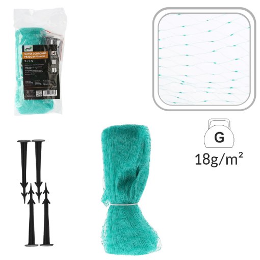 Пропонована сітка виготовлена з високоякісного поліпропілену низької щільності. Вона не створює значного навантаження на гілки. Сітка тонка та еластична, ідеально пристосовується до форми крони. Зелений колір робить її практично невидимою, що не порушує естетику саду. Ефективно захищає черешню, вишню, аґрус, чорницю та навіть полуницю. Сітка чудово підходить для винограду. Стійка до впливу атмосферних умов, може служити кілька сезонів.